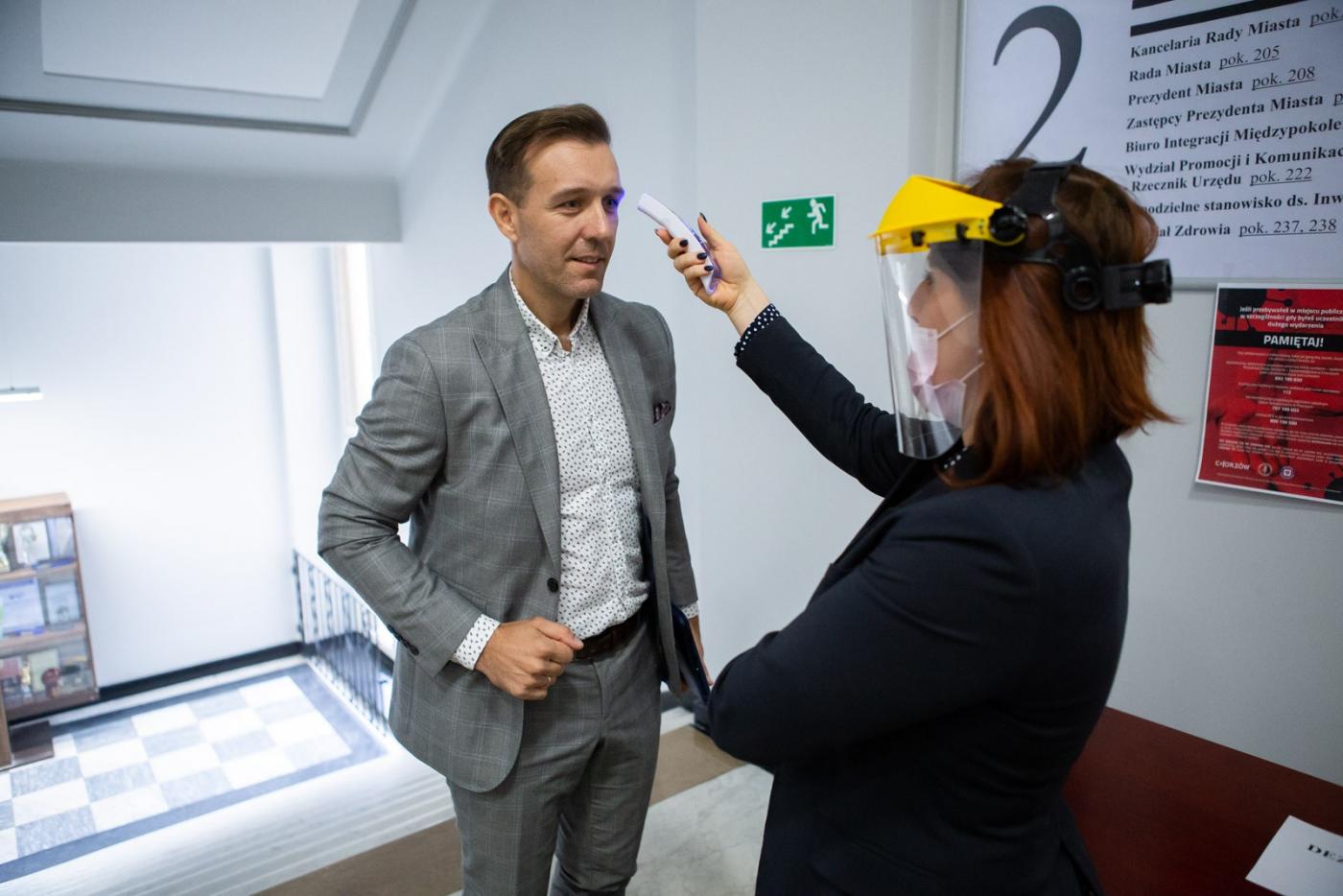 • Wszyscy radni, pracownicy UM i goście przed wejściem na salę sesyjną otrzymali rękawiczki, maseczki, zmierzono im temperaturę. Dostępne były też środki dezynfekujące