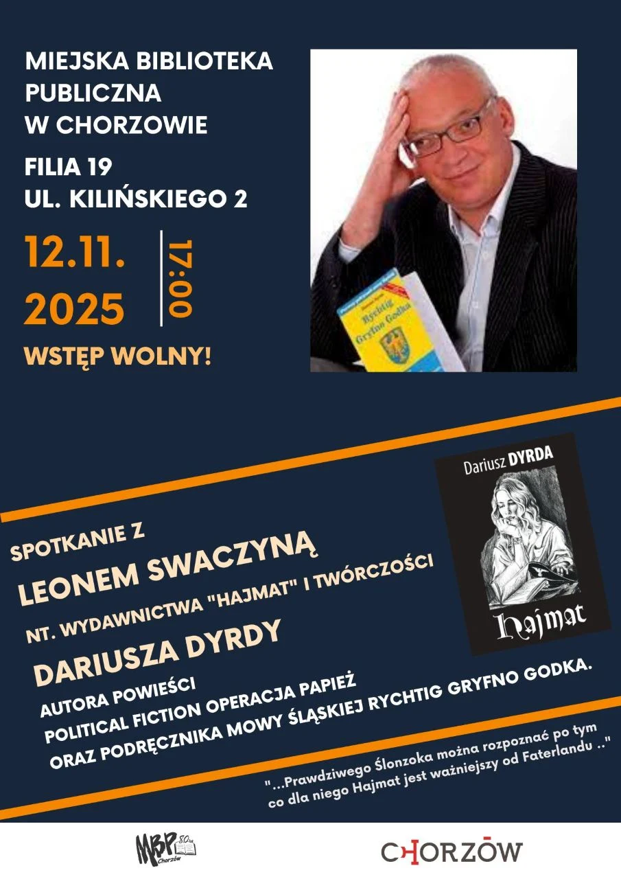 Spotkanie z Leonem Swaczyną pt. „…Prawdziwego Ślonzoka można rozpoznać po tym, co dla niego Hajmat jest ważniejszy od Faterlandu…”. Rozmowa poświęcona będzie działalności i twórczości śp. Dariusza Dyrdy – autora książki „Hajmat”, powieści „Operacja Papież” oraz podręcznika śląskiej mowy „Rychtig gryfno godka”.
