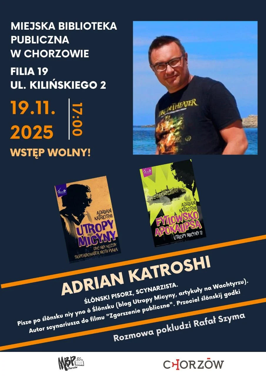 Spotkanie z Adrianem Katroshi – śląskim pisarzem i scenarzystą, autorem powieści „Utropy Micyny” i „Fytlowisko apokalipsa. Utropy Micyny 2”. To pełne humoru historie oparte na lokalnych realiach. Autor współtworzył także scenariusz filmu „Zgorszenie publiczne” i publikuje felietony w portalu Wachtyrz.eu.