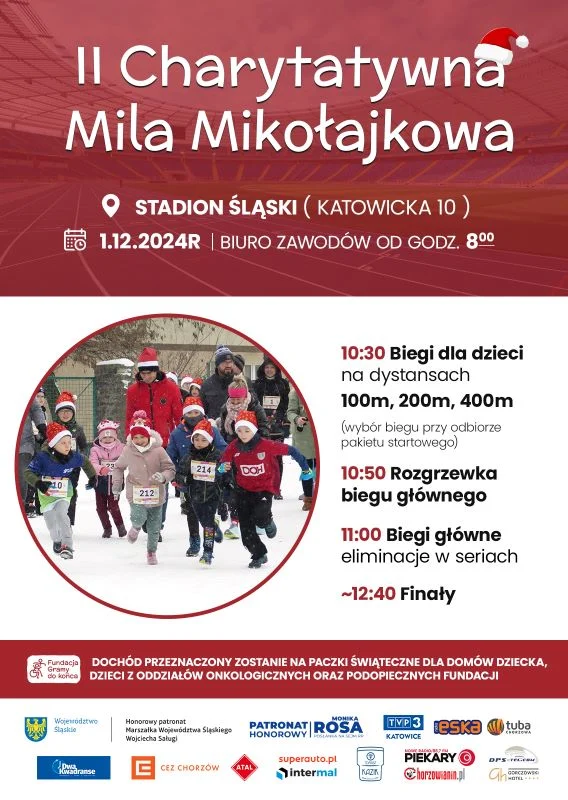 Już w najbliższą niedzielę (1.12) odbędzie się II Charytatywna Mila Mikołajkowa na Stadionie Śląskim! Na starcie zobaczymy ponad 300 biegaczy i biegaczek oraz ponad 120 dzieci, którzy zaprezentują się na dystansie 1 mili, a dzieci na wybrany przez siebie dystansie 100m, 200m oraz 400m.
