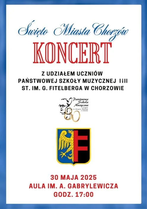 Z okazji obchodów Święta Miasta Chorzów, Państwowa Szkoła Muzyczna I i II stopnia im. Grzegorza Fitelberga zaprasza na wyjątkowy koncert w wykonaniu swoich uczniów. Wydarzenie odbędzie się 30 maja 2025 roku o godzinie 17:00 w auli im. A. Gabrylewicza, mieszczącej się w budynku szkoły przy ul. Dąbrowskiego 43 w Chorzowie.