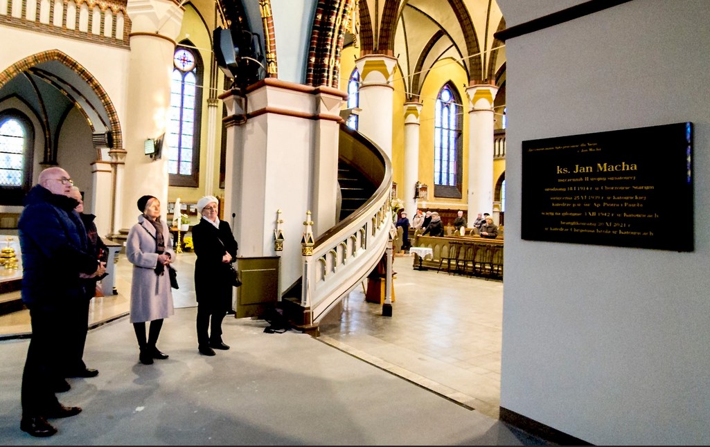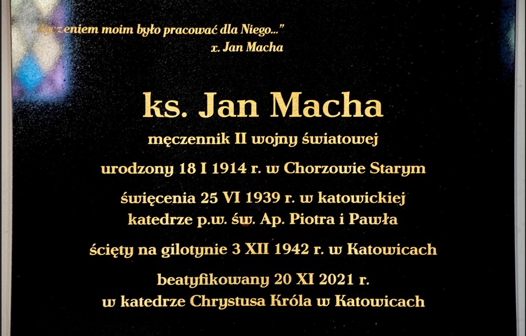 ks. Jan Macha/męczennik II wojny światowej/urodzony 18 I 1914 r. w Chorzowie Starym/święcenia 25 VI 1939 r. w katowickiej katedrze p.w. św. Ap. Piotra i Pawła/ścięty na gilotynie 3 XII 1942 r. w Katowicach/beatyfikowany 20 XI 2021 r. w katedrze Chrystusa Króla w Katowicach – takie informacje znalazły się na płycie zamontowanej na jednej ze ścian świątyni.