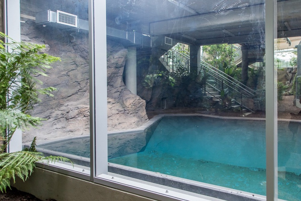 Poziom dolny pomieści cztery wydzielone wybiegi wewnętrzne, w tym jeden ze zbiornikiem wodnym oraz drugi zbiornik otwarty w poziomie posadzki, zasilany w wodę z kaskady wodnej, spływającej z górnego poziomu pomieszczenia. Zaprojektowano również strefę terrariów dla ekspozycji mniejszych gadów i płazów. W strefie wejścia do budynku od strony południowo-wschodniej, znajdować się będą pomieszczenia sanitarne ogólnodostępne oraz zaplecze gospodarcze obiektu. Południowo-zachodnią elewację części wysokiej budynku oraz ponad połowę połaci dachowej zaprojektowano jako fasadę szklaną w celu prześwietlenia ekspozycji światłem naturalnym.