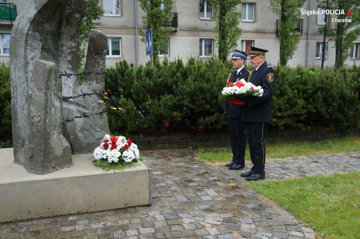 Uroczyste złożenie kwiatów pod pomnikiem więźniów “Bismarckhutte” w Chorzowie