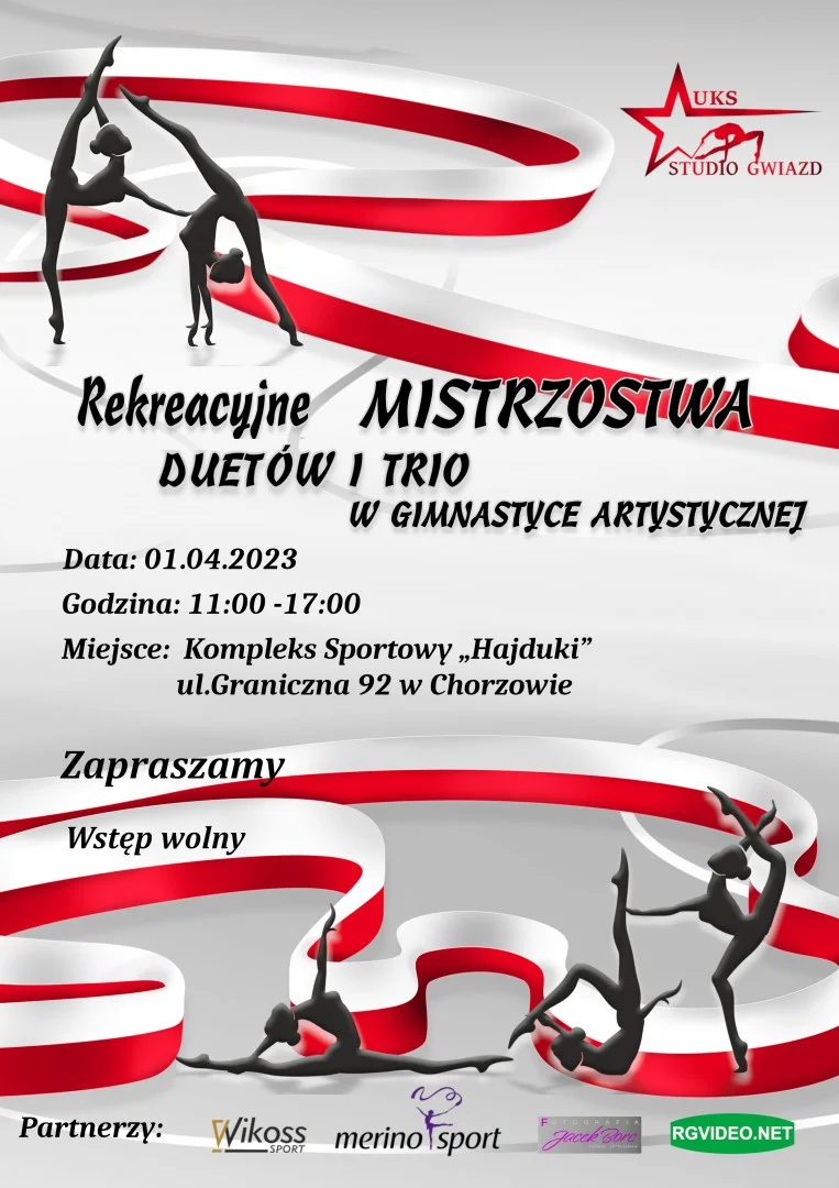 1 kwietnia 2023 w Chorzowie odbędą się pierwsze w Polsce tego typu Mistrzostwa Duetów i Trio w Gimnastyce Artystycznej dzieci ćwiczących rekreacyjnie.
