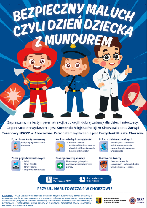 Na najmłodszych mieszkańców Chorzowa czekają liczne atrakcje, nagrody i niespodzianki. Będą pokazy sprzętu policyjnego, spotkania z funkcjonariuszami w mundurach oraz interaktywne zabawy edukacyjne. Wszystko po to, by dzieci już od najmłodszych lat uczyły się zasad bezpieczeństwa – w ruchu drogowym, w domu i na podwórku.