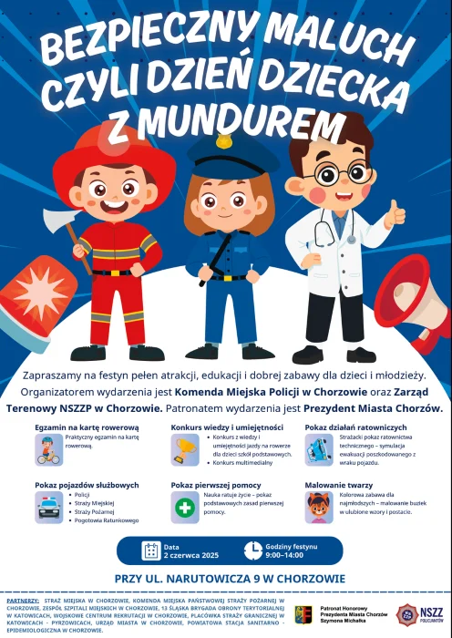 Już 2 czerwca w Chorzowie odbędzie się wyjątkowy festyn pod hasłem „Bezpieczny maluch, czyli Dzień Dziecka z mundurem”. Wydarzenie organizuje Komenda Miejska Policji w Chorzowie przy wsparciu Prezydenta Miasta. To świetna okazja, by połączyć radosną zabawę z edukacją w zakresie bezpieczeństwa.