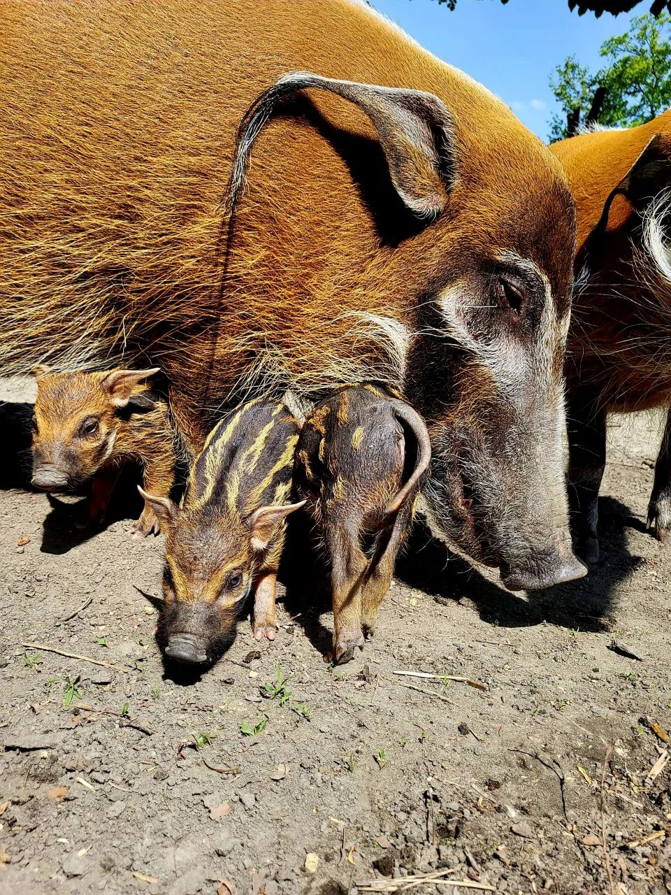 Nowo narodzone świnki rzeczne są pręgowane, pełne energii i bardzo ciekawskie. Choć są jeszcze niewielkie, już teraz śmiało eksplorują otoczenie. Maluchy rozwijają się prawidłowo i coraz chętniej opuszczają kryjówkę, by poznawać świat pod czujnym okiem mamy.