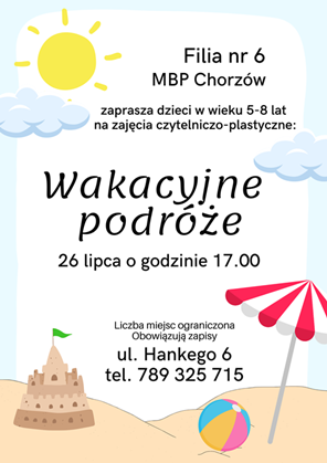 Filia nr 6 Miejskiej Biblioteki Publicznej w Chorzowie serdecznie zaprasza dzieci w wieku 5-8 lat na wyjątkowe zajęcia czytelniczo-plastyczne pt. “Wakacyjne podróże”.