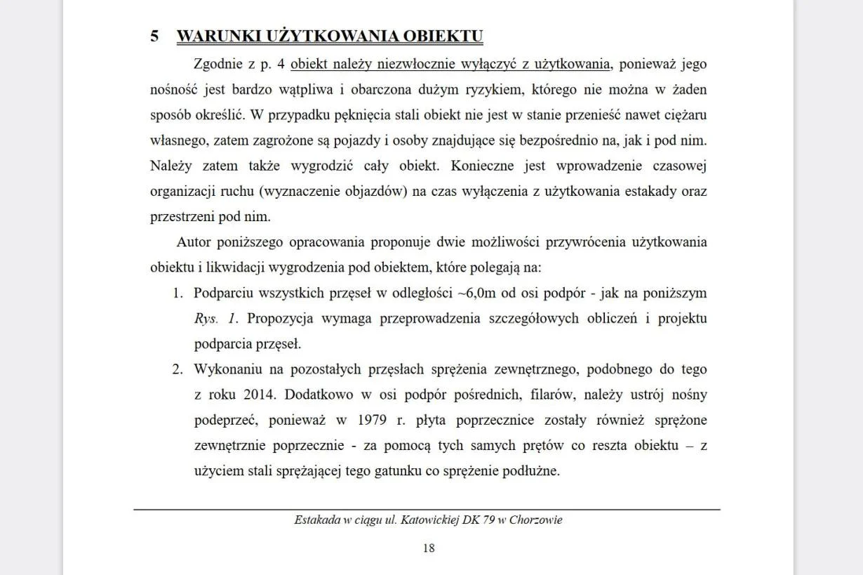 W związku z uzyskanymi informacjami Wojewódzki Inspektor Nadzoru Budowlanego podjął decyzję o nakazaniu Prezydentowi Chorzowa usunięcia zagrożenia bezpieczeństwa estakady poprzez wykonanie tymczasowego podparcia wszystkich przęseł obiektu do dnia 31 sierpnia 2025 roku. Takie rozwiązanie przewiduje ekspertyza zamówiona przez miasto Chorzów, która stałasię podstawą do wyłączenia estakady z ruchu (fragmenty dokumentu na zdjęciach). O przyszłości estakady powinny zdecydować władze Chorzowa. Ewentualna decyzja o wyburzeniu obiektu będzie oznaczała konieczność przygotowania projektu rozbiórki, przeprowadzenia niezbędnych uzgodnień i wyłonienia wykonawcy prac. Zgodnie z obowiązującymi przepisami zadania te musi wykonać miasto Chorzów. Opracowanie niezbędnej dokumentacji będzie zadaniem czasochłonnym. Formalności mogą trwać wiele miesięcy, a ewentualne wyburzenie estakady może nastąpić nawet za 2 lata. – czytamy w oświadczeniu z 8 czerwca.