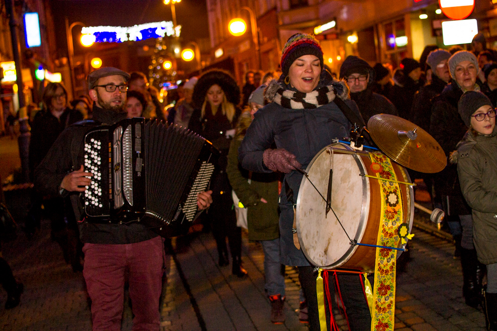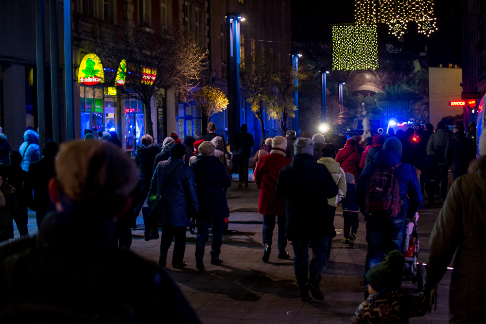 Kolorowy tłum z bombkami i oprawą muzyczną, w asyście służb mundurowych – policji i straży miejskiej – oraz Świętego Mikołaja, przeszedł spod poczty na teren Parku Hutników, aby wspólnie zawiesić ozdoby na kilkumetrowym, świątecznym drzewku.