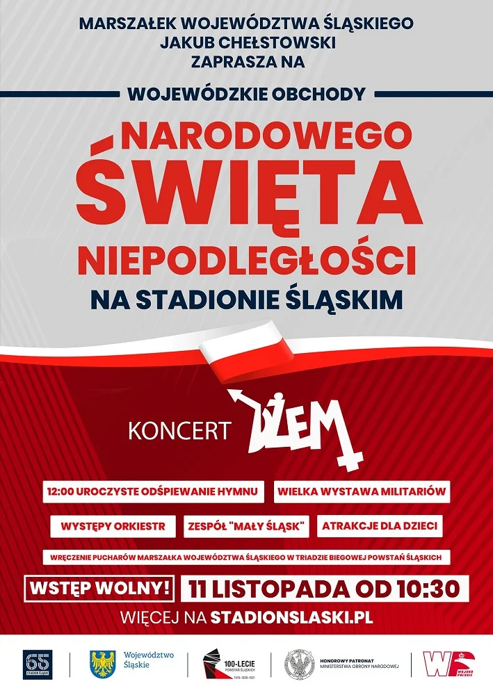 11 listopada po raz kolejny spotkajmy się na Stadionie Śląskim! Wojewódzkie Obchody Narodowego Święta Niepodległości to wydarzenie, podczas którego nie zabraknie odśpiewania hymnu, wielkiej wystawy militariów oraz występów muzycznych i atrakcji dla najmłodszych. Gwiazda wieczoru – zespół Dżem, a wstęp na całość będzie darmowy! – czytamy na stronie wydarzenia.