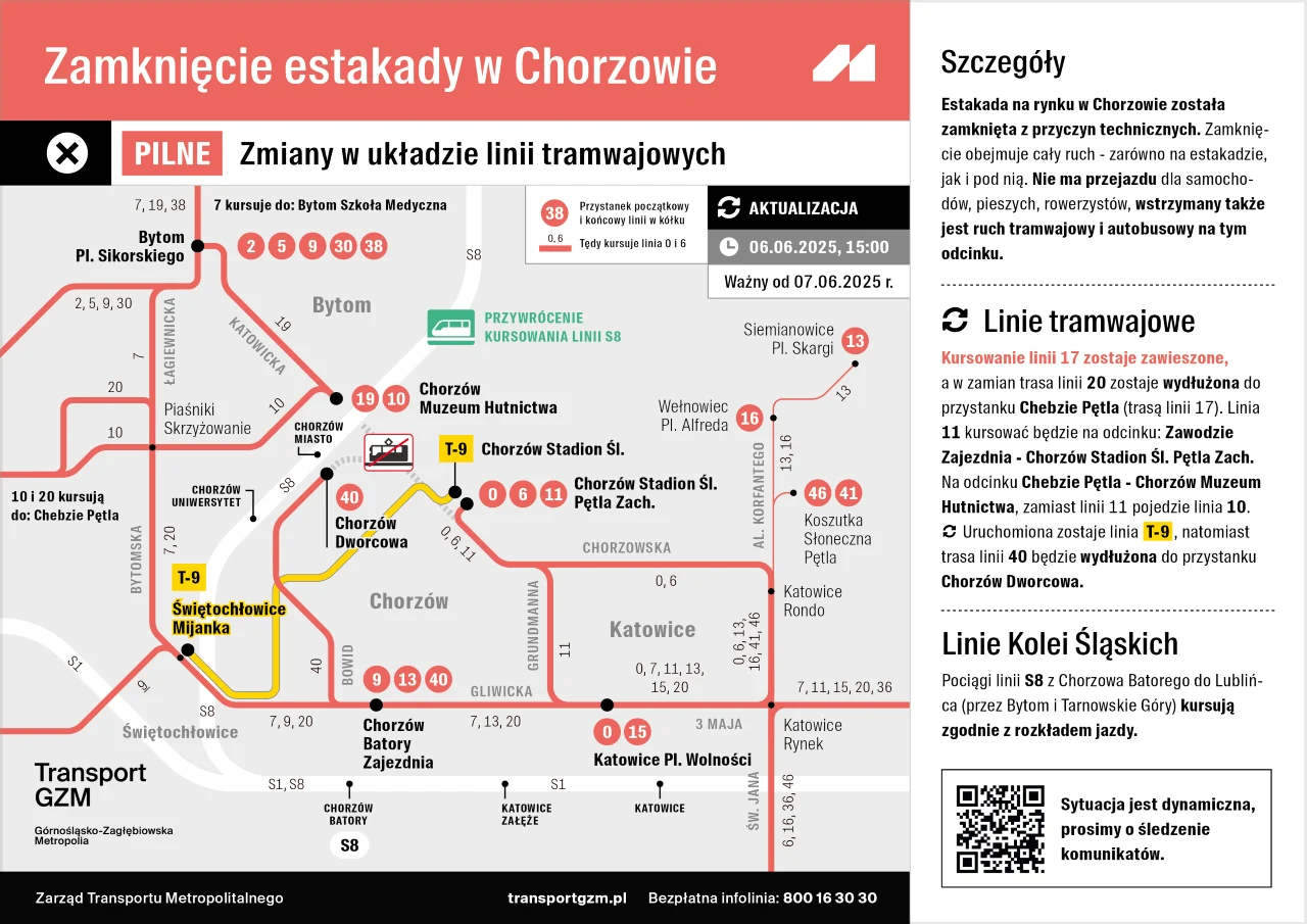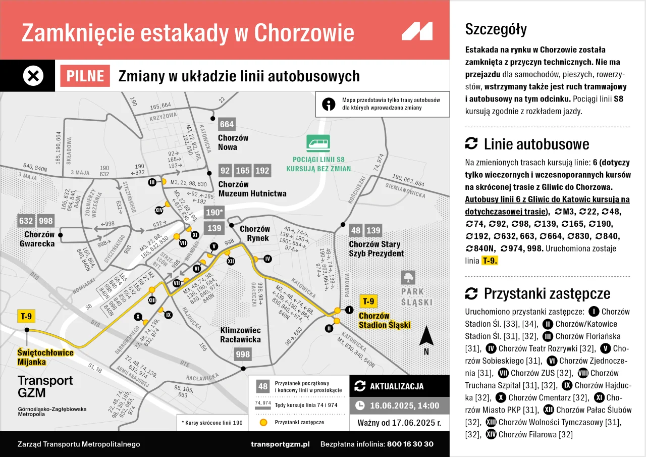 Od 17 czerwca zmieniono rozkłady jazdy 15 linii autobusowych: 22, 48, 74, 92, 98, 139, 165, 190, 632, 664, 830, 840, 840N, 974 i M3. Autobusy pojadą trasami, na których ruch aktualnie odbywa się płynniej. Dotyczy to m.in. M3 – trasa objazdowa będzie już krótsza, a liczba przystanków obsługiwanych w Chorzowie przez tę linię zmniejszy się z 9 do 4. Część zmian obejmie także linie 6, 663, 998 i T-9.