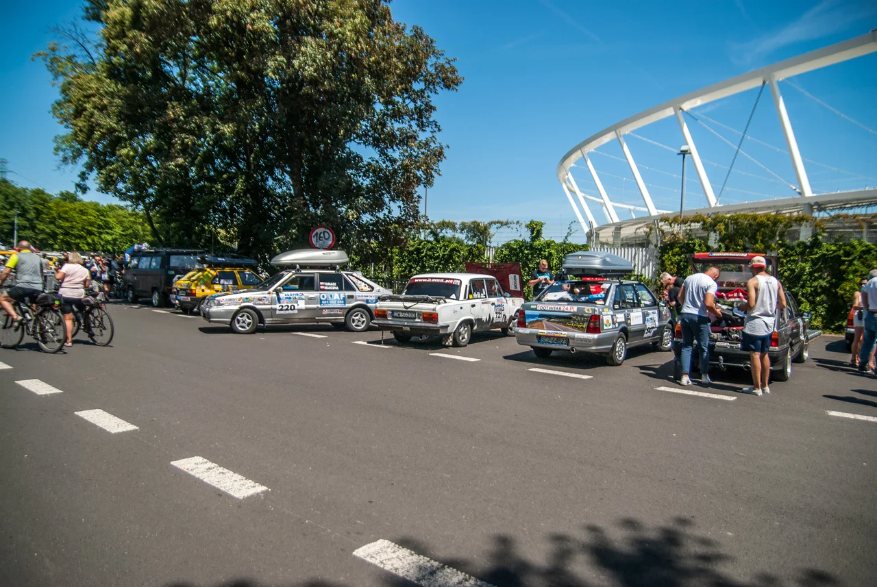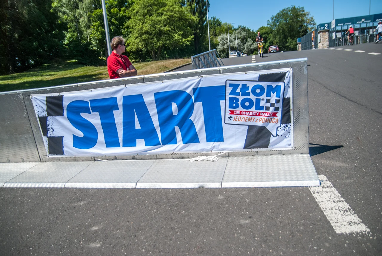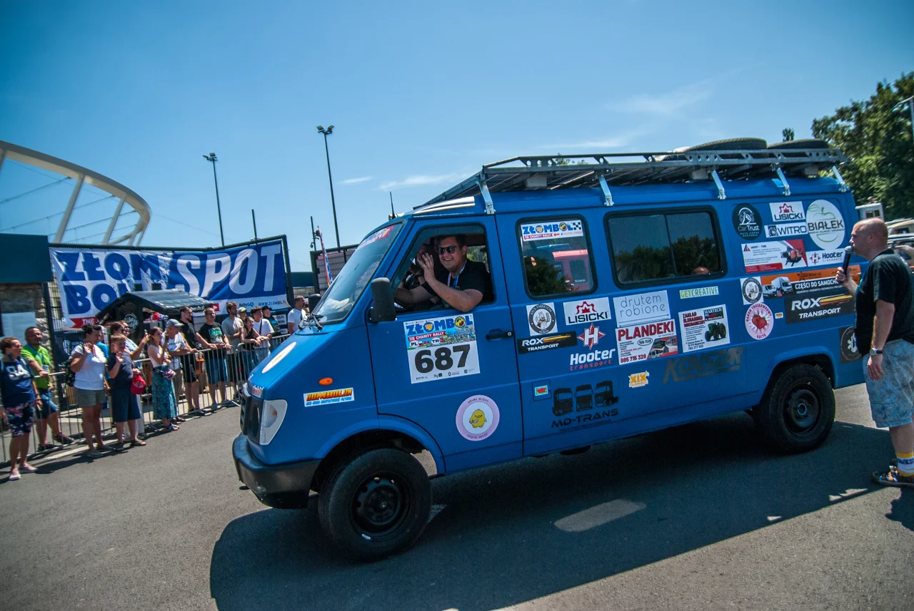 Równo o godzinie 12:00, gdy docieraliśmy powolutku pod Stadion Śląski, rozległa się głośna muzyka, kanonada klaksonów i 19 charytatywny rajd Złombol ruszył z kopyta. Wprawiono w ruch tysiące koni mechanicznych, w powietrze wzniósł się huk i zapach spalin.