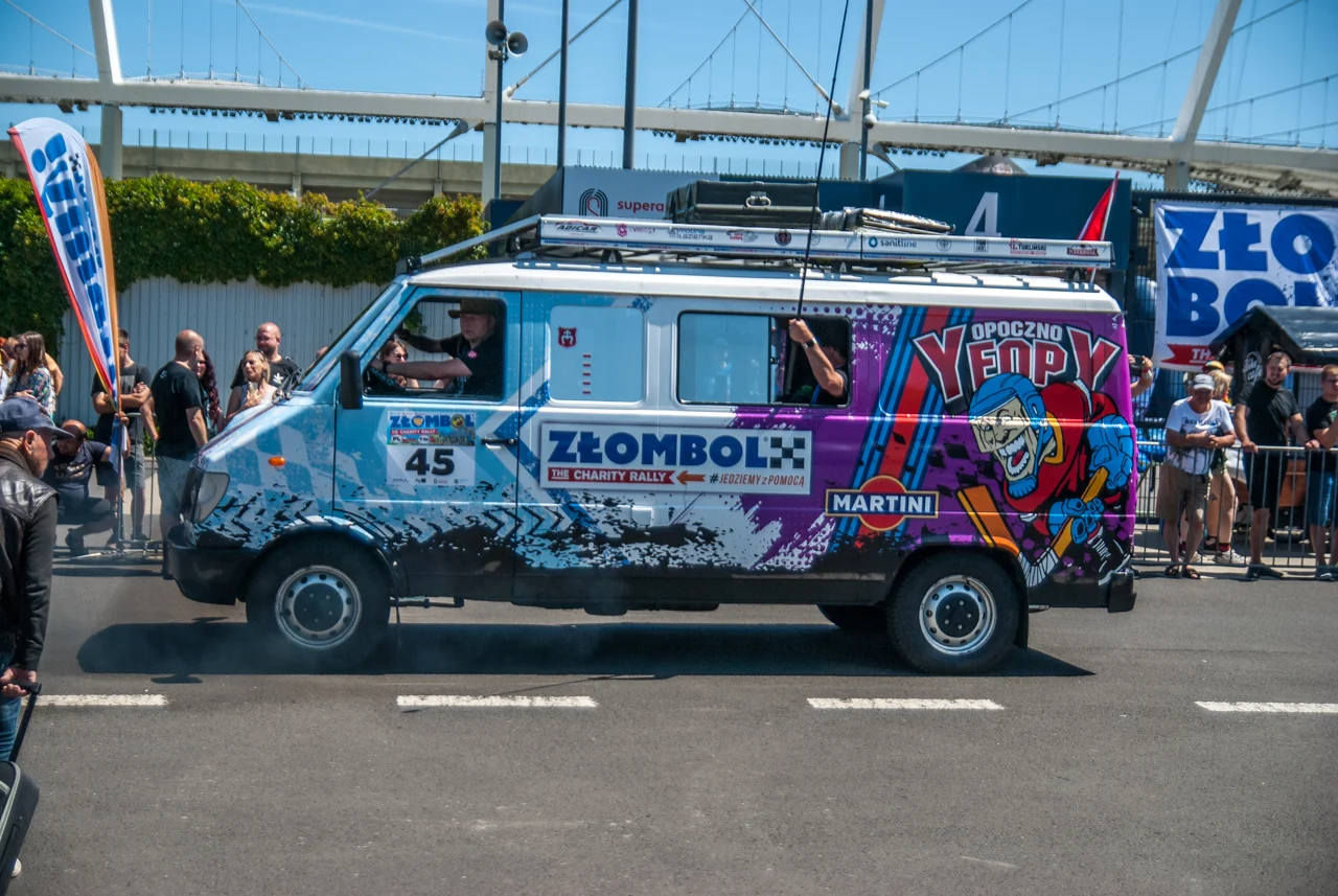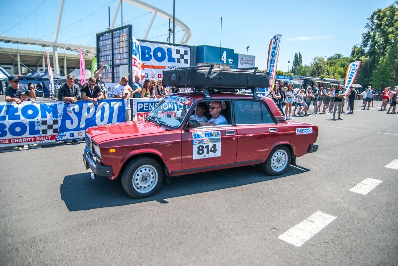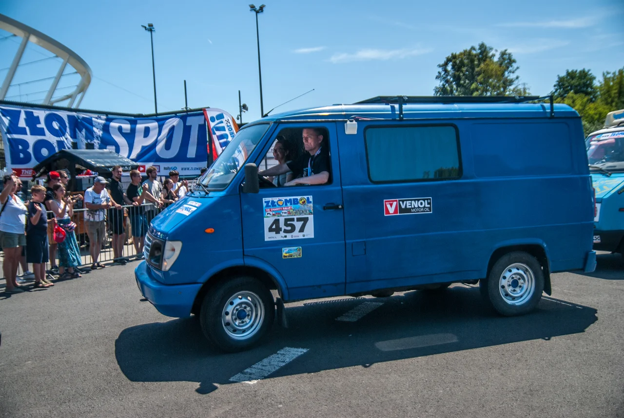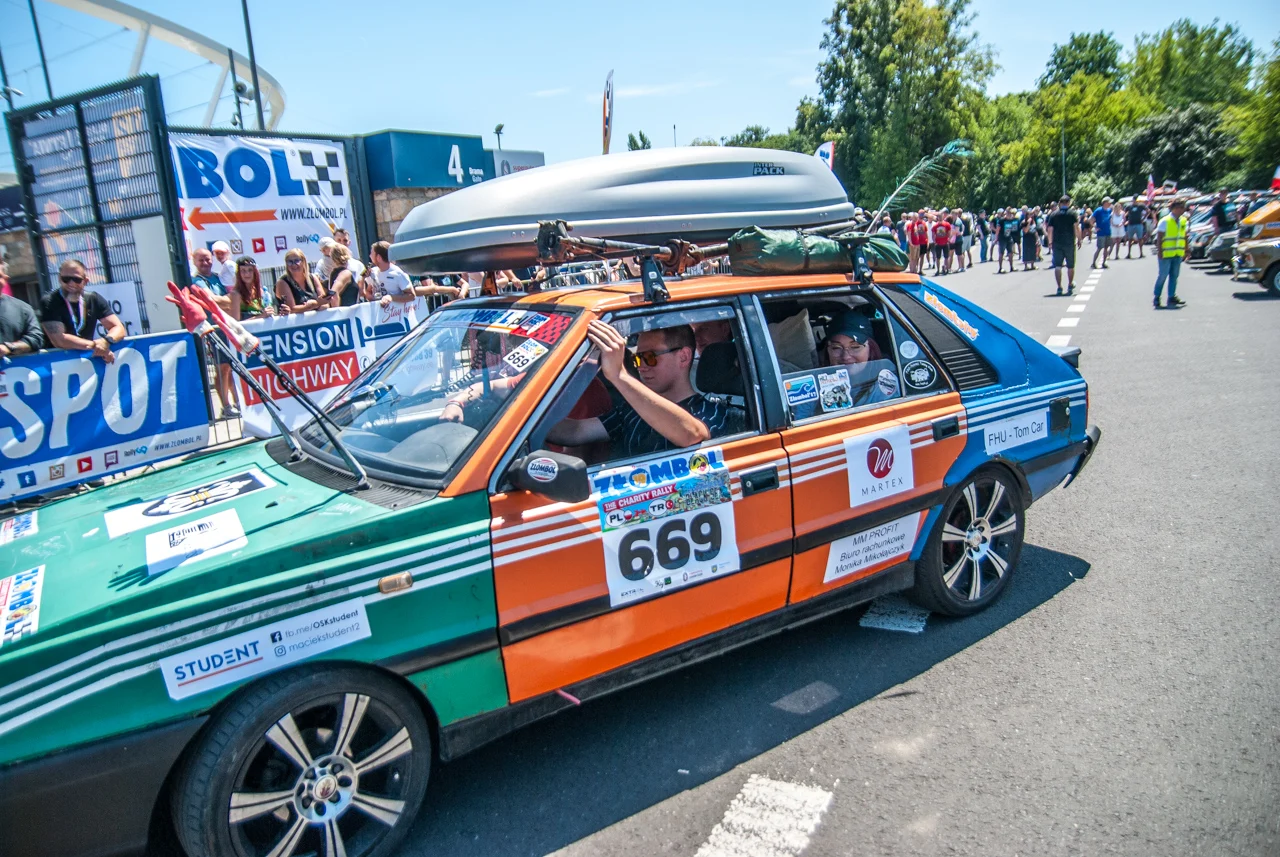 Równo o godzinie 12:00, gdy docieraliśmy powolutku pod Stadion Śląski, rozległa się głośna muzyka, kanonada klaksonów i 19 charytatywny rajd Złombol ruszył z kopyta. Wprawiono w ruch tysiące koni mechanicznych, w powietrze wzniósł się huk i zapach spalin.