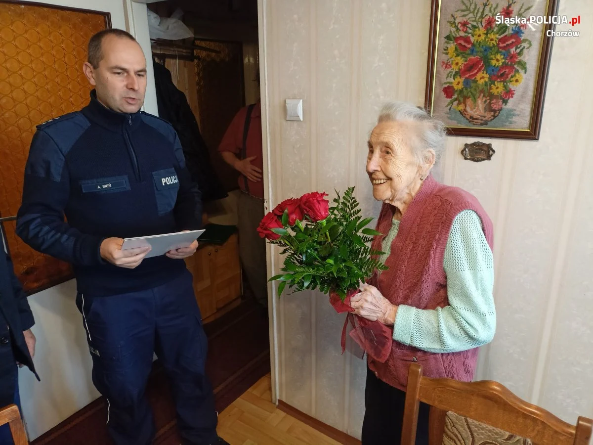 Życzenia dalszych lat w zdrowiu, pełnych optymizmu, rodzinnego ciepła i wszelkiej pomyślności złożył prezes Chorzowskiego Koła Stowarzyszenia Emerytów i Rencistów Policyjnych nadkom. w st. spocz. Ireneusz Pukowski oraz podinsp. w st.spocz. Wiesław Horyń. Serdeczne życzenia kolejnych lat życia Jubilatce złożyli również przedstawiciele chorzowskiego garnizonu Policji.