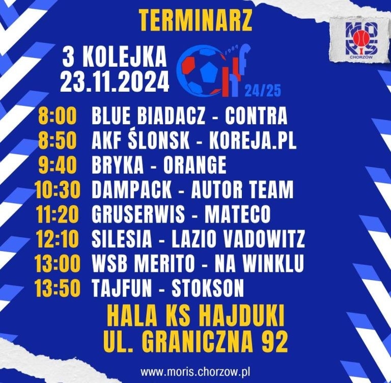 Mecze będą rozgrywane w hali KS Hajduki, przy ul. Granicznej. Czeka nas kolejna dawka emocji, a dla kibiców – okazja do dopingu i wspólnego przeżywania sportowych chwil. MORiS Chorzów zachęca do zapoznania się z pełnym godzinnym harmonogramem nadchodzących spotkań. To idealna okazja, by zarezerwować czas na oglądanie rywalizujących drużyn i poczuć atmosferę emocjonujących pojedynków!