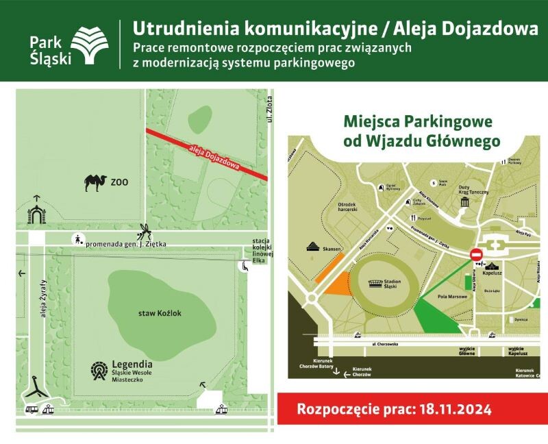 Od 18 listopada 2024 roku Aleja Dojazdowa, która prowadzi od wjazdu do Parku Śląskiego przy ul. Złotej aż do bocznego wejścia do Śląskiego Ogrodu Zoologicznego, zostanie całkowicie zamknięta dla ruchu. Decyzja ta wynika z planowanych prac modernizacyjnych systemu parkingowego.