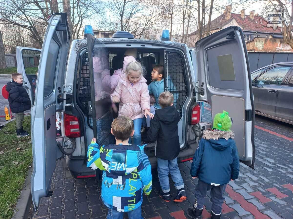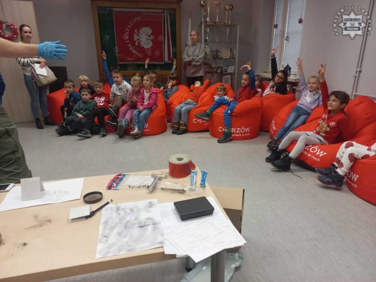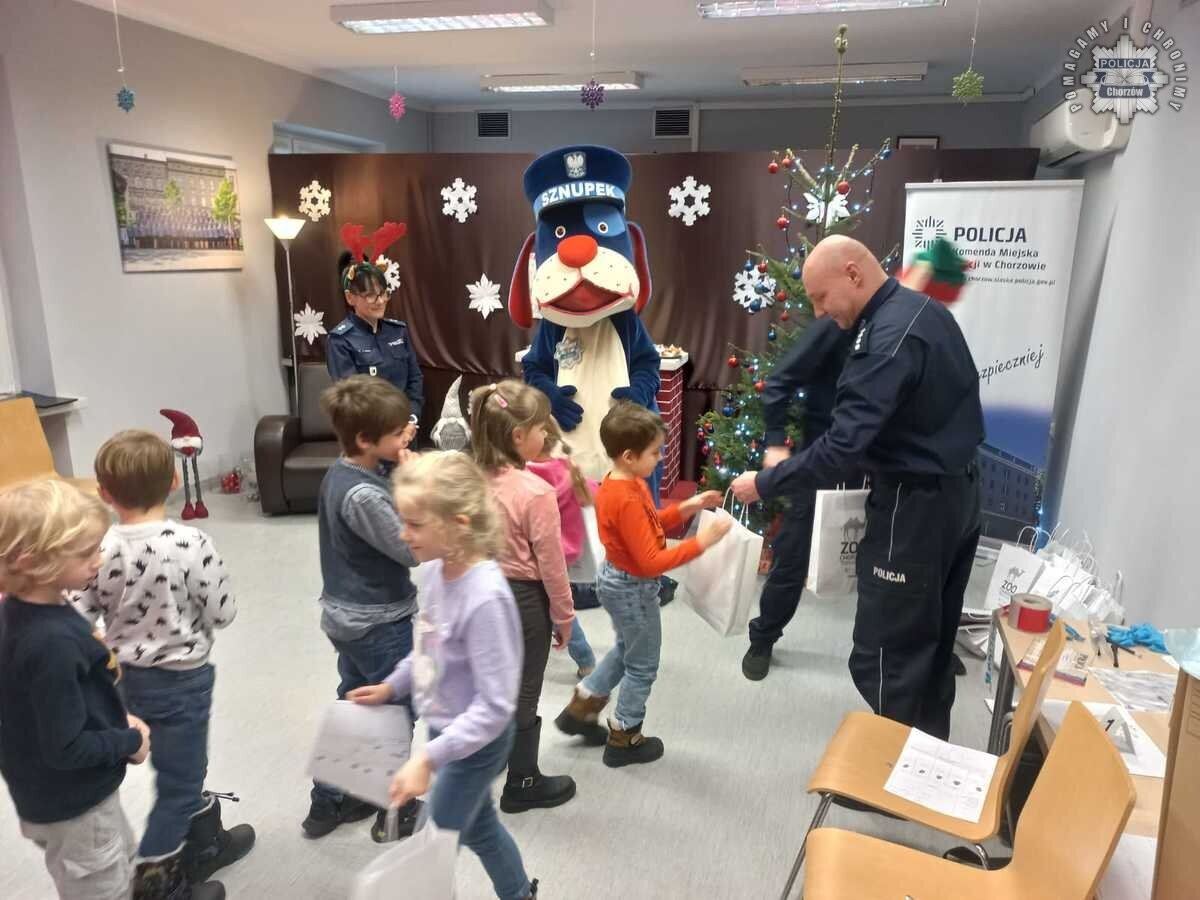Dzieci z pierwszej klasy Szkoły Podstawowej nr 12 w Chorzowie odwiedziły Komendę Miejską Policji. Spotkanie było nagrodą w ramach konkursu plastycznego „Bezpieczna Zima ze Sznupkiem”. Dzieci oprócz zwiedzania komendy otrzymały skromne upominki.