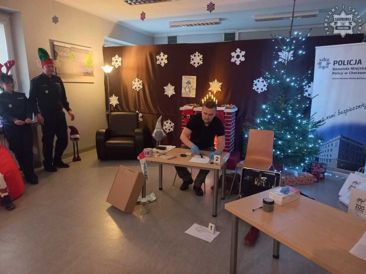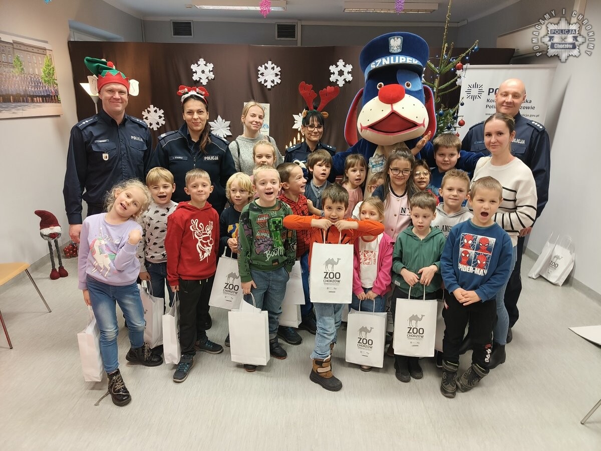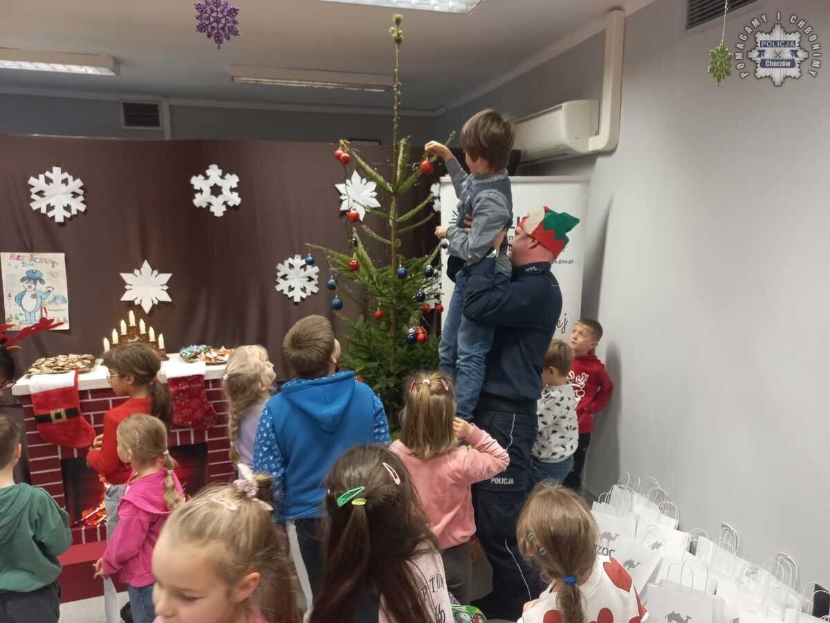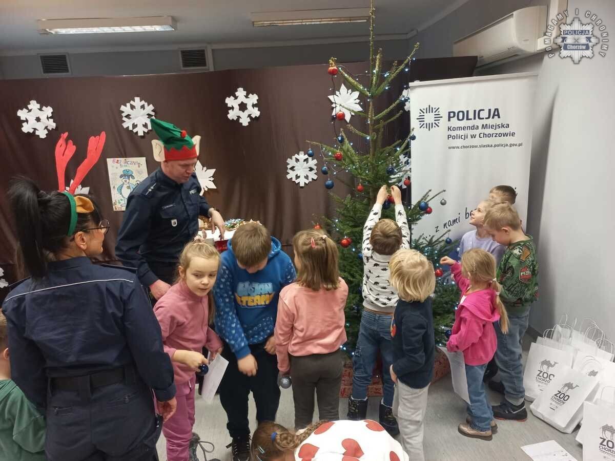 Kolejną atrakcją było wspólne ubranie choinki, których nawet najwyższe gałązki udało się udekorować wspólnymi siłami. Nie zabrakło świątecznych opowieści oraz pierniczków. Na zakończenie dzieci otrzymały drobne upominki, które oprócz chorzowskiej komendy ufundował Śląski Ogród Zoologiczny oraz Urząd Miasta w Chorzowie. Nagrody zwycięskiej klasie wręczył Pierwszy Zastępca Komendanta Miejskiego w Chorzowie nadkomisarz Michał Madej.