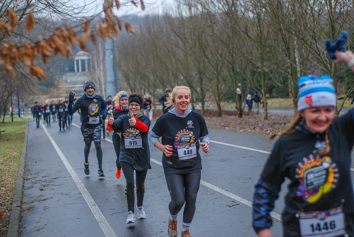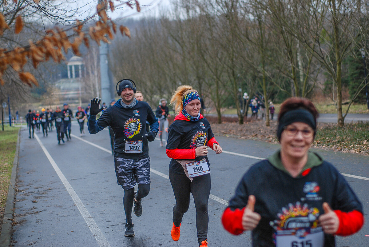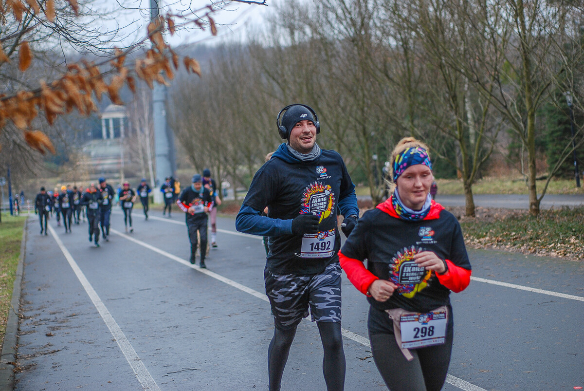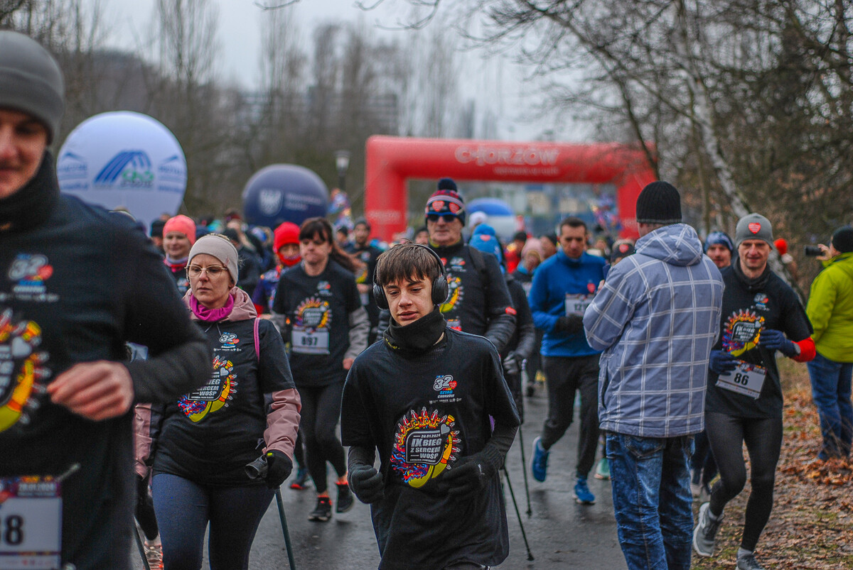 Gdy zbliżyliśmy się do punktu startowego trwała właśnie rozgrzewka dla zawodników. Nie wszyscy byli na miejscu, więc wydawało się, że uczestników jest około 500. Tymczasem na numerach startowych pojawiały się liczby 800, 951, 1150 i kolejne. Chwilę po 12 kolorowy tłum biegaczy wyruszył na parkowe alejki, by wspólnie, na sportowo, wspierać Wielką Orkiestrę Świątecznej Pomocy.