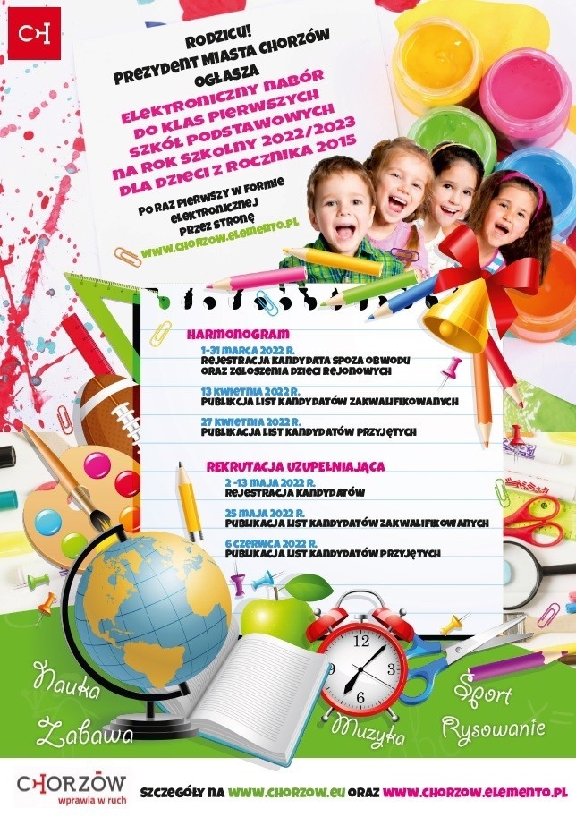 Terminy określa Zarządzenie Nr OR.13.2022. z dnia 20 stycznia 2022r. Prezydenta Miasta Chorzów http://bip.chorzow.eu/index.php?id=164215591838416727 w sprawie ustalenia harmonogramu czynności w postępowaniu rekrutacyjnym i postępowaniu uzupełniającym dla kandydatów do klas pierwszych szkół podstawowych prowadzonych przez Miasto Chorzów, na rok szkolny 2022/2023:
