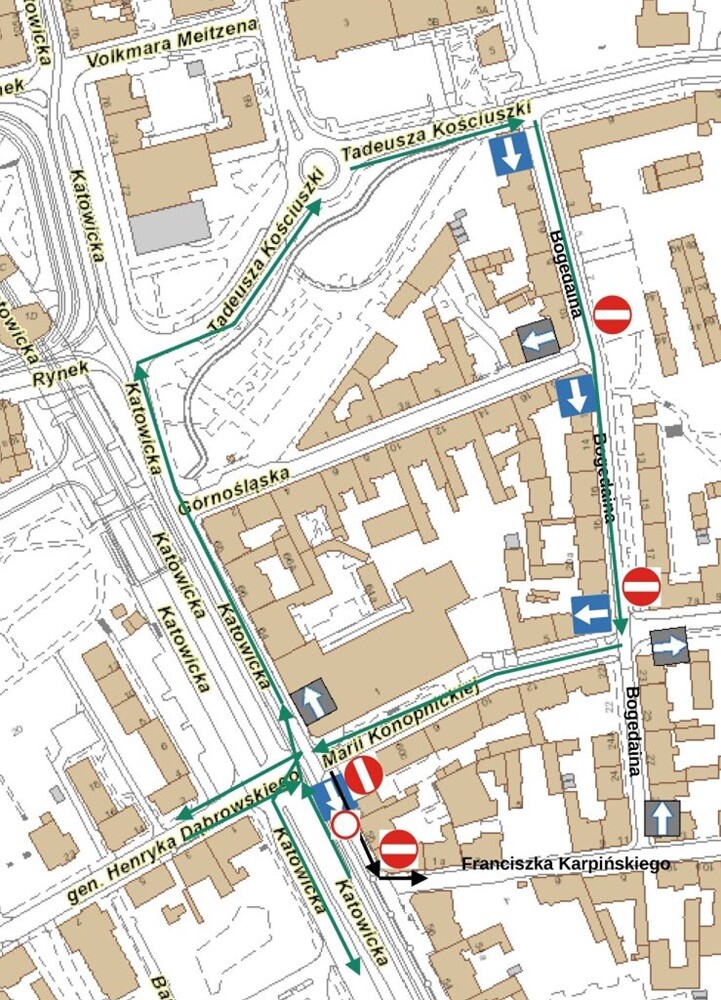 - Kierowcy poruszający się ul. Katowicką i Dąbrowskiego będą kierowani ul. Katowicką (stary przebieg), następnie ul. Kościuszki i dalej ul. Bogedaina do ul. Konopnickiej.