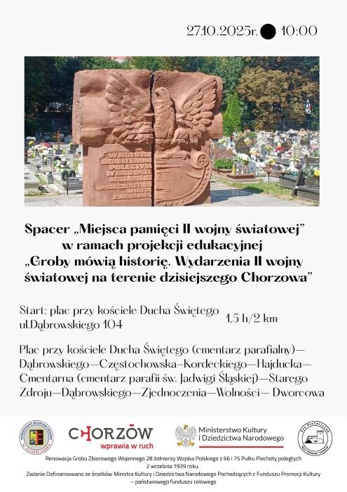 Miasto Chorzów wraz ze Stowarzyszeniem Miłośników Chorzowa im. Juliusza Ligonia zapraszają na wyjątkową projekcję i spacer edukacyjny „Groby mówią historię. Wydarzenia II wojny światowej na terenie dzisiejszego Chorzowa”. Wydarzenie odbędzie się 27 października 2025 roku (poniedziałek) o godz. 10:00. Start zaplanowano przy kościele Ducha Świętego, ul. Dąbrowskiego 104.