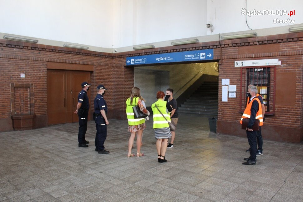 Dzielnicowi z jedynki wspólnie z inspektorami Państwowej Powiatowej Inspekcji Sanitarnej w Chorzowie kontrolowali dworzec kolejowy oraz perony pasażerskie. Wspólne działania były ukierunkowane na problem należytego przestrzegania zasad stosowania ograniczeń, nakazów i zakazów w związku z wystąpieniem stanu epidemii. W trakcie działań stróże prawa prowadzili szeroko zakrojoną akcję informacyjną, wręczali ulotki informacyjne, maseczki jednorazowe, zachęcając do ich bezwzględnego stosowania. Reagowali również na ujawnione naruszenia obowiązujących przepisów prawa.