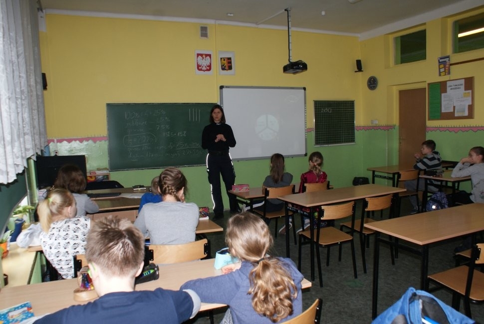 Policjantka zajmująca się profilaktyką w chorzowskiej komendzie, spotkała się z uczniami Szkoły Podstawowej nr 12 w Chorzowie.