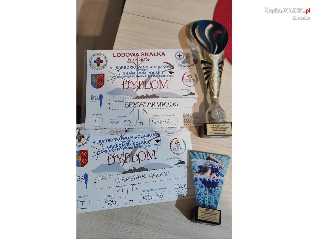 W zorganizowanym na basenie Ośrodka Sportu i Rekreacji „Skałka” wydarzeniu brało udział prawie 60 pływaków. Wśród nich znajdował się policjant z naszej komendy. W dniu rywalizacji temperatura wody w basenie miała jedynie 2,7 stopnia. Powietrze było jeszcze chłodniejsze, jego temperatura wynosiła 0,7 stopnia. Mundurowy pracujący na co dzień w chorzowskiej drogówce dwa razy stanął na najwyższym stopniu podium. Starszy aspirant Sebastian Walicki wygrał wyścigi na dystansie 500 m stylem dowolnym, oraz 50 m motylkiem.