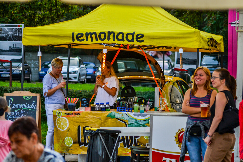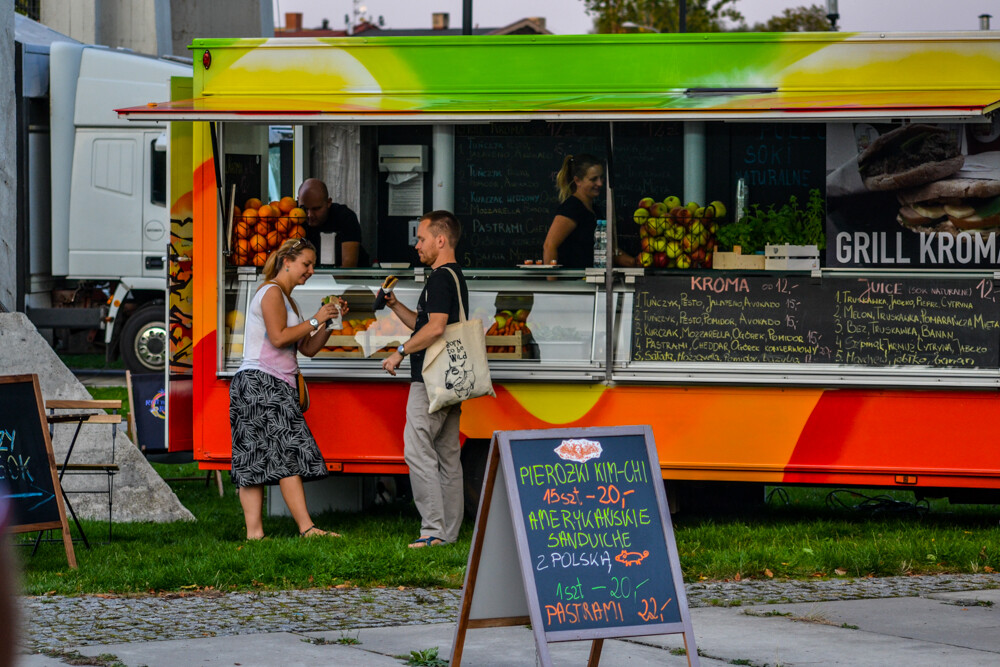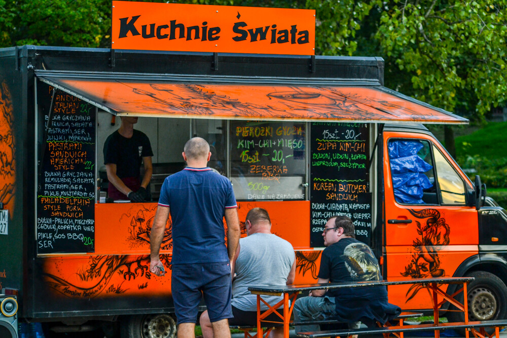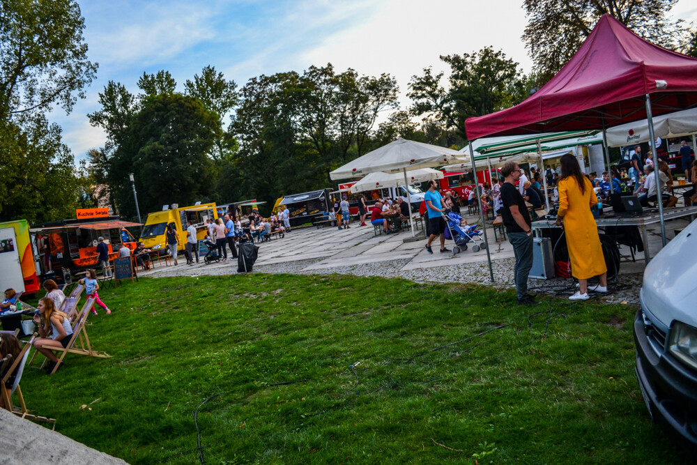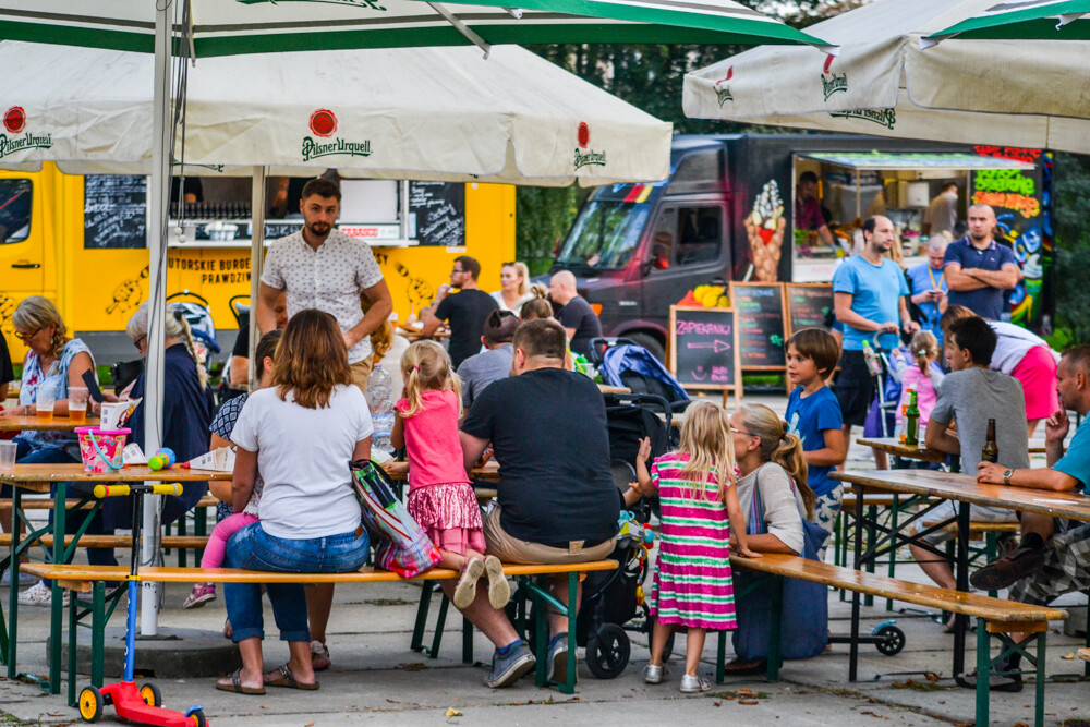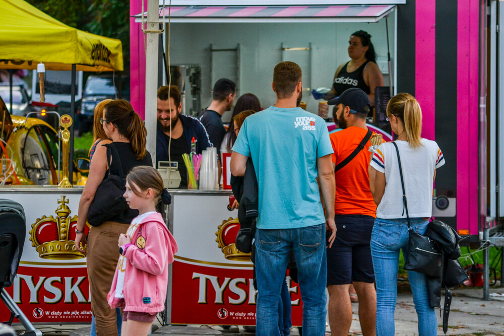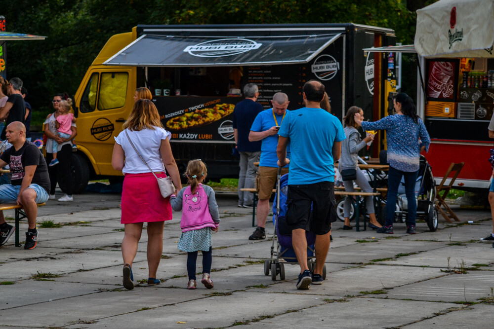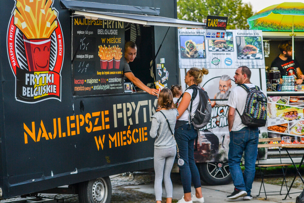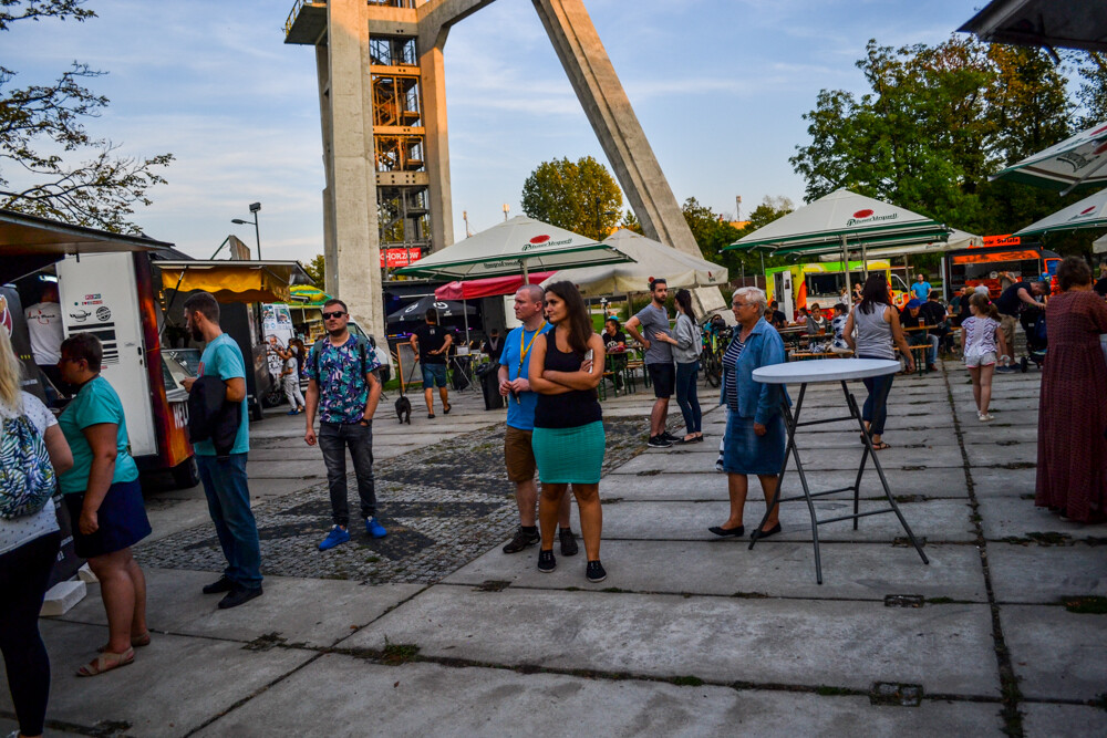 W piątkowy wieczór ludzi było całkiem sporo, wszak pogoda w dalszym ciągu dopisuje. Na brukowanym placu pod wieżą szybową pojawiło się około 10 pojazdów, serwujących klasyczne frytki i burgery, a także kuchnię meksykańską czy gruzińską. Jest w czym wybierać i gdzie usiąść, bo miejsc raczej nie brakowało.