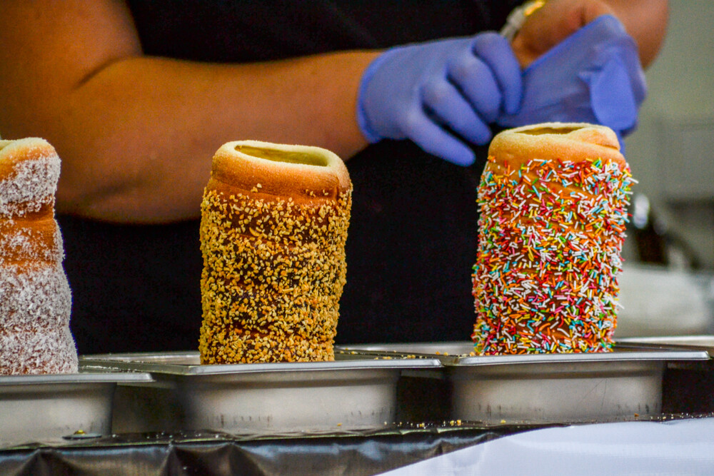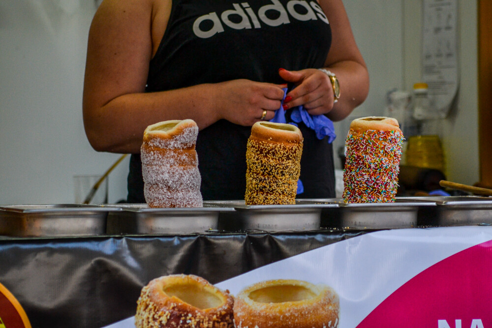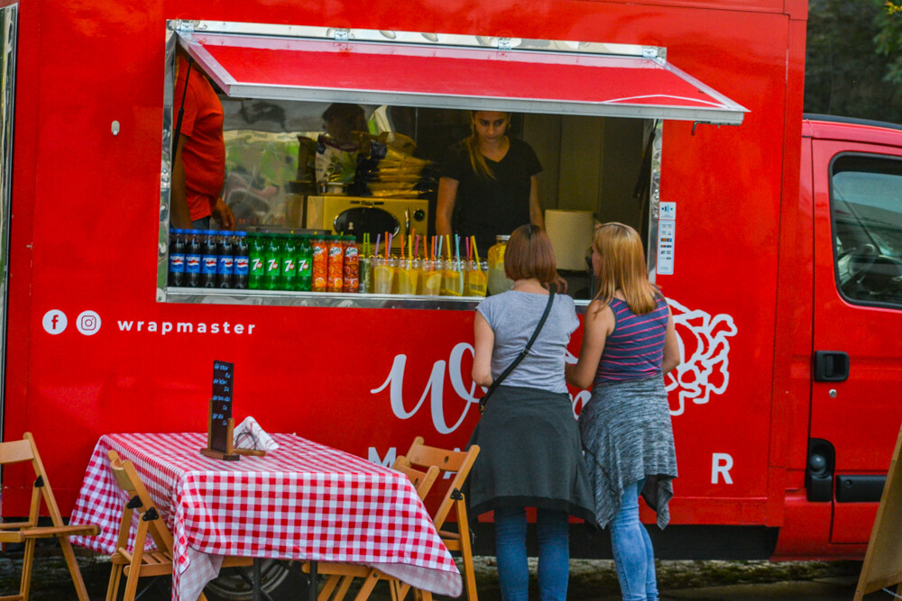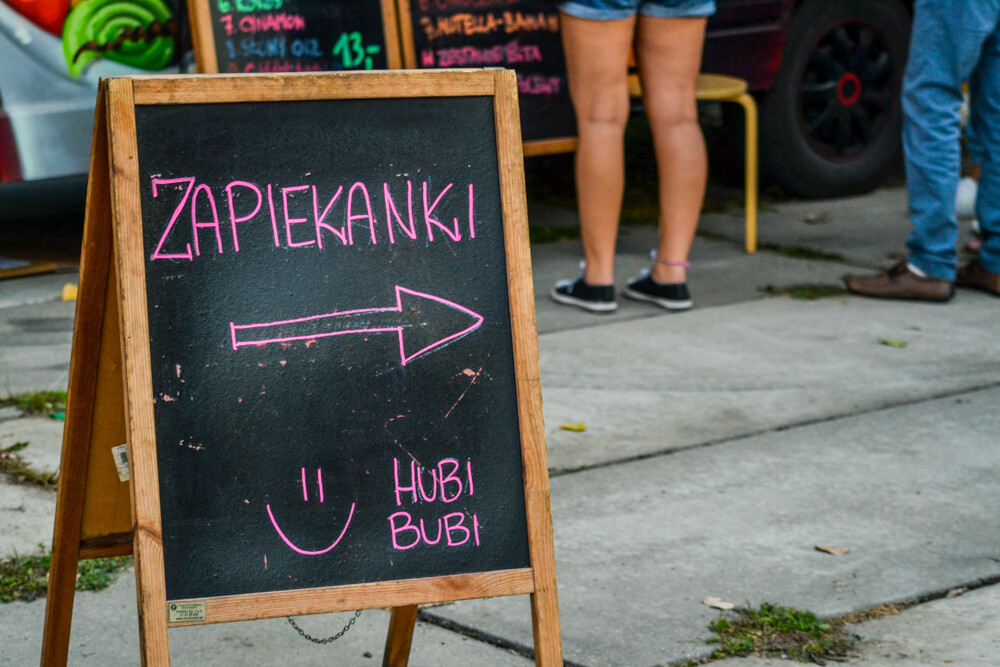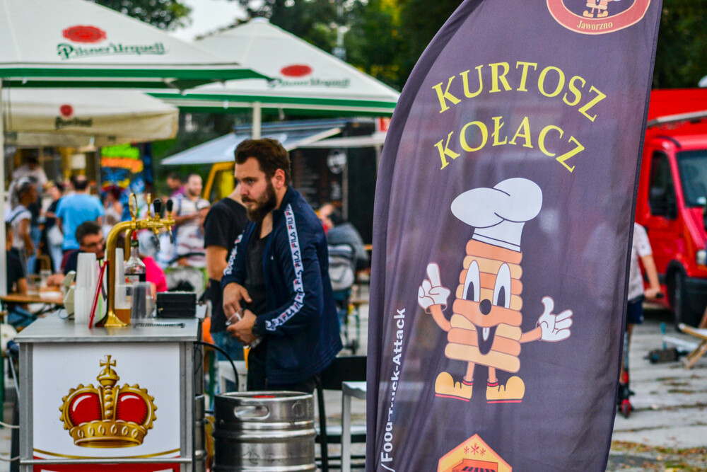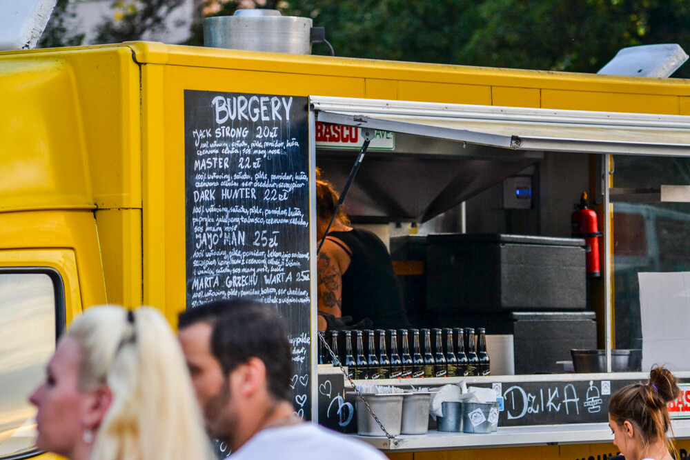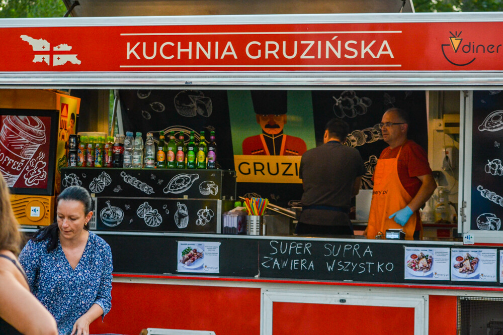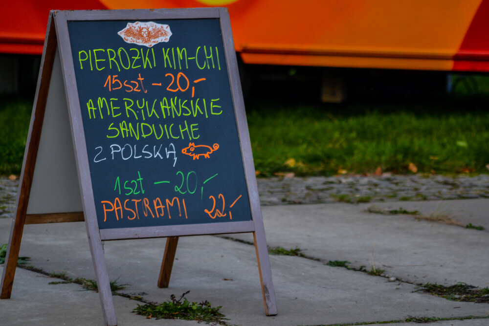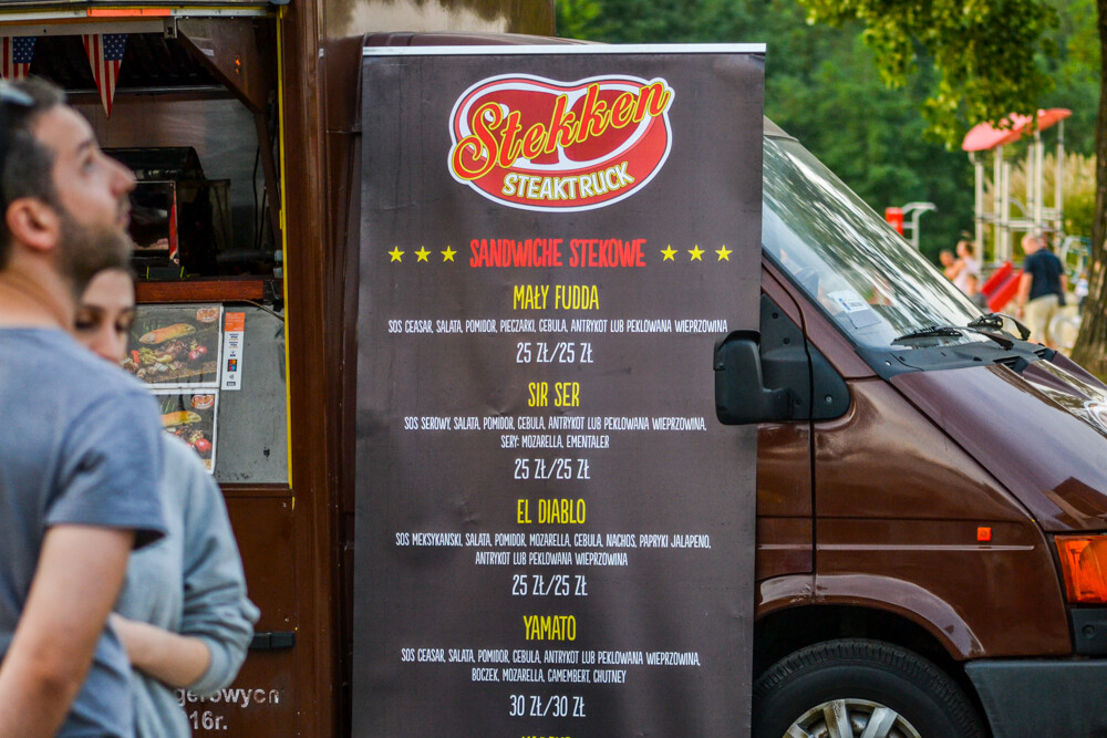 W piątkowy wieczór ludzi było całkiem sporo, wszak pogoda w dalszym ciągu dopisuje. Na brukowanym placu pod wieżą szybową pojawiło się około 10 pojazdów, serwujących klasyczne frytki i burgery, a także kuchnię meksykańską czy gruzińską. Jest w czym wybierać i gdzie usiąść, bo miejsc raczej nie brakowało.
