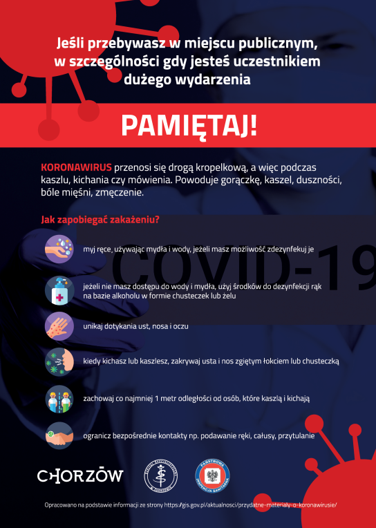 W Chorzowie nie odnotowano potwierdzonego przypadku koronawirusa, ale widząc sytuację w kraju i na świecie, a także stosując się do decyzji Premiera informujemy: