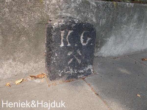 H: Okazało się, że wykonywane były z różnych materiałów: piaskowca, granitu, kilka jakby z betonu lub kamienia sztucznego. Jedne mają tylko inicjały KG na boku inne oprócz inicjałów także kuple. Z tym że czasem inicjały były wykute na ich szczycie i te mogły oznaczać zmianę kierunku granicy pola, co w jednym przypadku by się zgadzało.