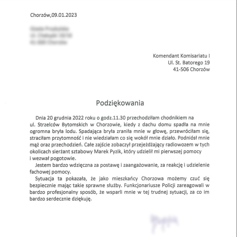 Do niebezpiecznej sytuacji doszło 20 grudnia 2022 r. na ul. Strzelców Bytomskich w Chorzowie. Z dachu jednej z kamienic oderwał się duży kawałek lodu, uderzając w głowę przechodzącą chodnikiem mieszkankę naszego miasta. W towarzystwie rannej kobiety znajdował się jej mąż. Przejeżdżający obok dzielnicowi sierż. szt. Marek Pyzik oraz mł. asp. Andrzej Szymanek zauważyli całą sytuację, natychmiast zatrzymali się i udzielił kobiecie pierwszej pomocy. Następnie pozostali na miejscu oczekując na przyjazd ratowników medycznych.