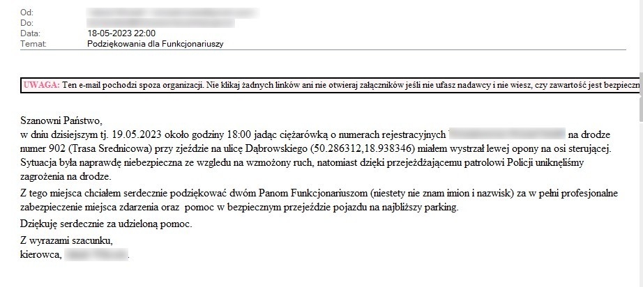 Na ręce Komendanta Miejskiego Policji w Chorzowie wpłynęły podziękowania dla chorzowskich policjantów. Służbę, w myśl motta: „Pomagamy i chronimy”, docenił jeden z kierowców.
