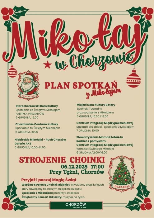 Chorzowianie będą mieli okazję stworzyć niezwykłą, pełną koloru i symboli lokalnej społeczności choinkę. Organizatorzy zachęcają do przygotowania autorskich ozdób i wspólnego dekorowania drzewka. Całości towarzyszyć będą muzyka, orkiestra oraz świąteczne animacje. Nie zabraknie także najbardziej wyczekiwanego gościa – Świętego Mikołaja, który zadba o jeszcze bardziej magiczną atmosferę.