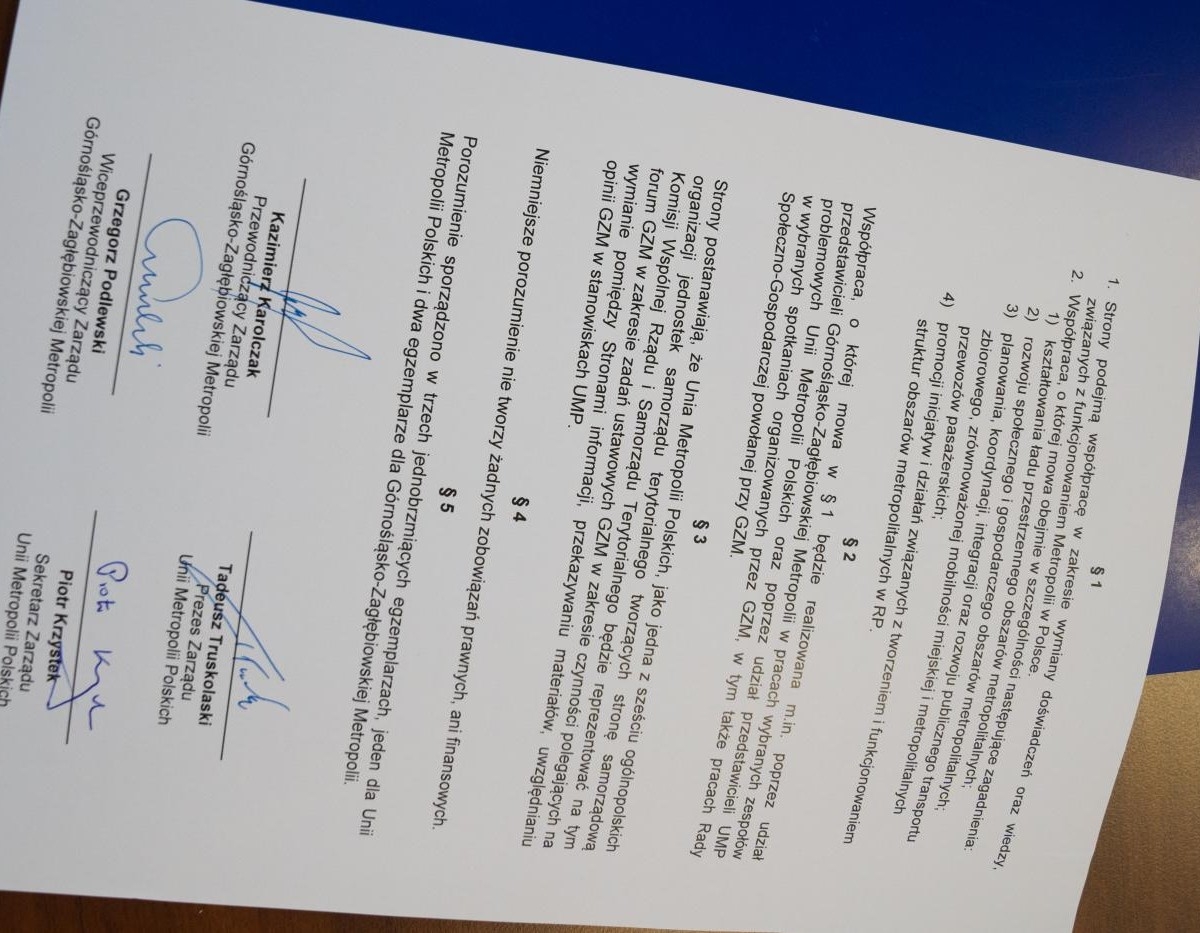 Rozmowy na temat naszej współpracy w Unią Metropolii Polskich były podejmowane już w pierwszych tygodniach funkcjonowania Górnośląsko-Zagłębiowskiej Metropolii. Ponieważ jesteśmy zupełnie nową strukturą w historii polskiego samorządu, należało najpierw ustalić, na jakich zasadach ta współpraca miałaby się odbywać – mówi Kazimierz Karolczak, przewodniczący zarządu GZM. Dzięki podpisanemu porozumieniu, będziemy współpracować w działaniach związanych z kształtowaniem ładu przestrzennego, rozwojem społecznym i gospodarczym, rozwojem transportu zbiorowego i promocją obszarów metropolitalnych. Są to dla nas kluczowe zagadnienia, dlatego cieszę się, że będziemy mieli w tym zakresie wsparcie silnych partnerów – dodaje.