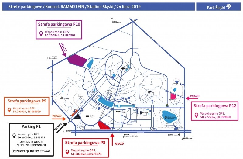 Możliwość wjazdu na parkingi w godzinach 11:00 – 21:00. Ilość miejsc parkingowych na terenie Parku Śląskiego w dniu imprezy jest ograniczona, dlatego w przypadku braku miejsc parkingowych wjazdy do Parku Śląskiego zostaną zamknięte. Ze względu na ograniczoną ilość miejsc zachęcamy do przyjazdu komunikacją miejską.