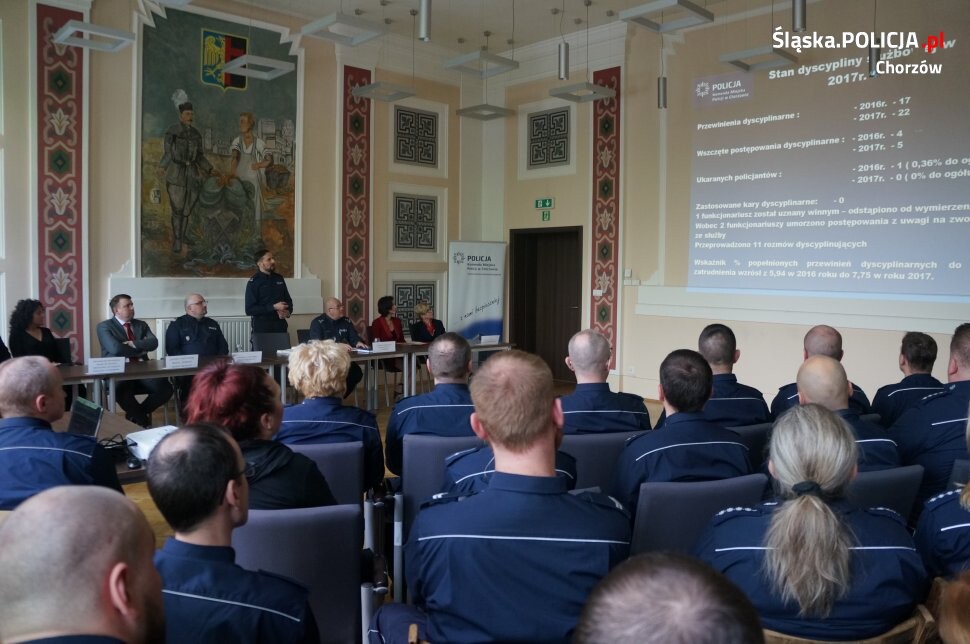 W naradzie zorganizowanej w gmachu Prokuratury Rejonowej w Chorzowie uczestniczył Komendant Wojewódzki Policji nadinsp. Krzysztof Justyński, Zastępca Prezydenta Miasta Marcin Michalik, Pełnomocnik Prezydenta Miasta ds. Polityki Zdrowotnej i Aktywizacji Społecznej Magdalena Sekuła, Prokurator Rejonowy w Chorzowie Katarzyna Małecka - Kowalczyk, Zastępca Prokuratora Rejonowego w Chorzowie Katarzyna Musialik, Dyrektor Wydziału Zarządzania Kryzysowego i Ochrony Ludności Jacek Króliczek, Komendant Straży Miejskiej w Chorzowie Izabela Jaron, Komendant Miejski Policji w Chorzowie podinsp. Robert Łuszcz, I-wszy Zastępca Komendanta Miejskiego Policji w Chorzowie mł. Insp. Piotr Sielecki, kadra kierownicza, policjanci i pracownicy cywilni chorzowskiego garnizonu. Naradę rozpoczął Komendant Miejski Policji w Chorzowie podinsp. Robert Łuszcz, składając podziękowania za wytężoną pracę wszystkim policjantom i pracownikom chorzowskiej komendy. Odrębne podziękowania skierował do władz miasta za udział oraz wsparcie przedsięwzięć podejmowanych na rzecz poprawy bezpieczeństwa. Następnie Zastępca Komendanta Miejskiego Policji w Chorzowie mł. insp. Piotr Sielecki podsumował wyniki pracy pionu prewencji chorzowskiej policji w 2017 roku, natomiast efekty pracy pionu kryminalnego omówił szef chorzowskich policjantów podinsp. Robert Łuszcz, ponadto wskazał on zadania i priorytety na rok 2018.
