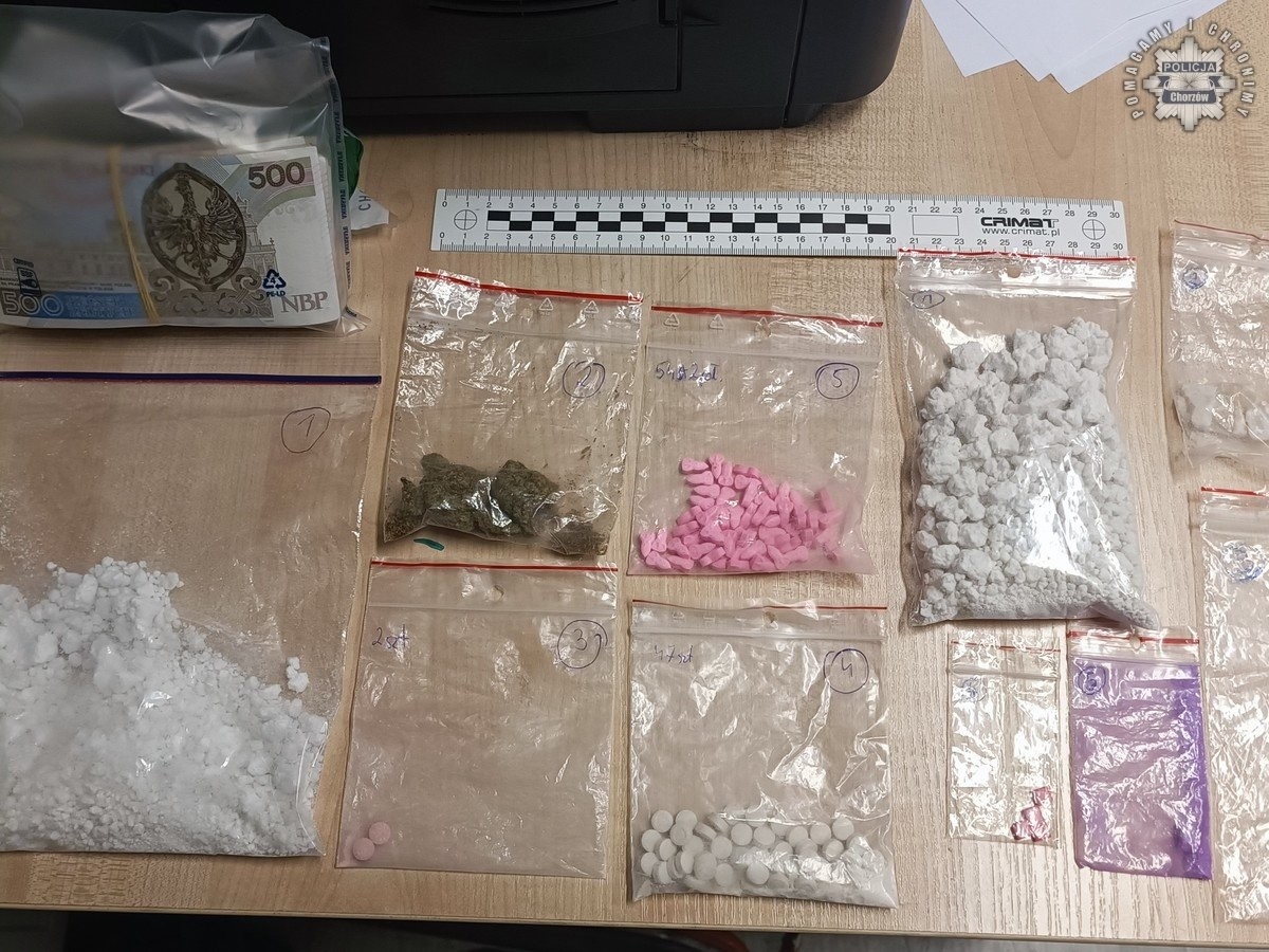 W tym samym dniu policjanci otrzymali informację, że także 43-letni mieszkaniec Chorzowa może mieć w swoim mieszkaniu narkotyki. Pojechali pod podany adres, gdzie podczas przeszukania znaleźli woreczki z różnymi substancjami. Dodatkowo przeszukali jego samochód, gdzie znajdowały się dwa pakunki z białymi tabletkami. W tym przypadku testy także potwierdziły, że znalezione substancje to amfetamina, marihuana oraz tabletki ecstasy. Z zabezpieczonych narkotyków, można by sporządzić prawie kolejny tysiąc „porcji” dilerskich.
