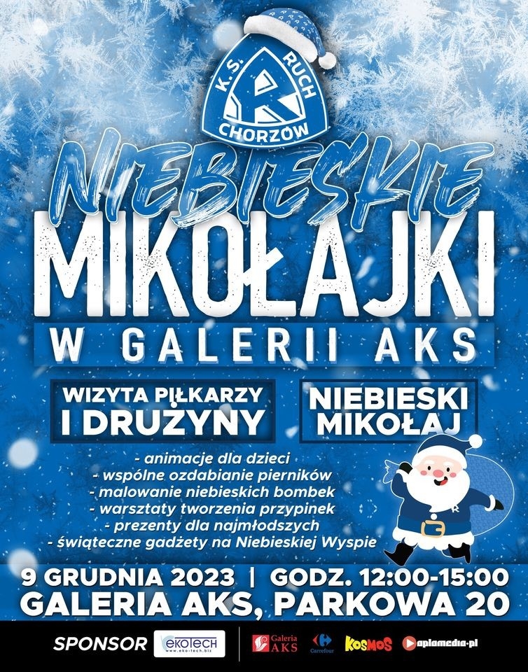 W najbliższą sobotę, 9 grudnia Galerię AKS zlokalizowaną przy ulicy Parkowej 20 odwiedzi wyjątkowy gość – Niebieski Mikołaj! Na osoby biorące udział w wydarzeniu Ruch Chorzów, który jest jego organizatorem, przygotował całe mnóstwo atrakcji. W programie przewidziano: