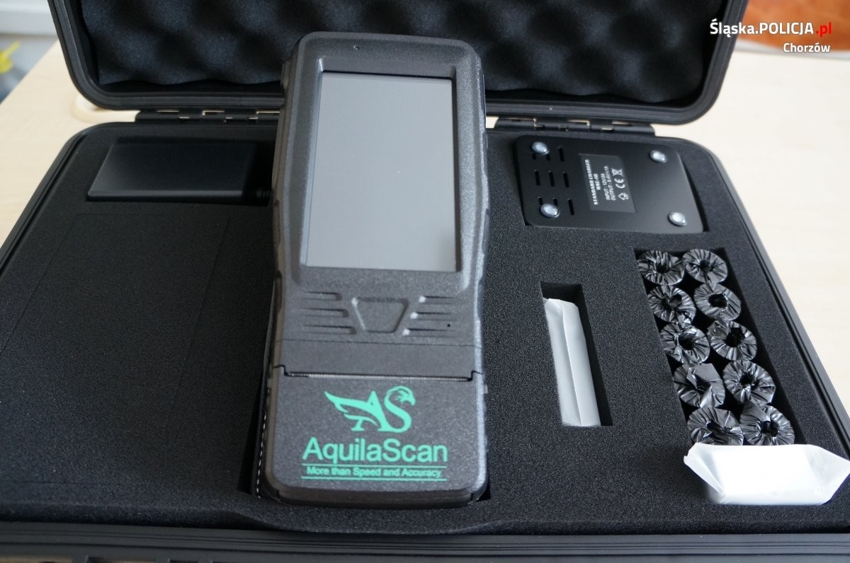 AquilaScan jest elektronicznym urządzeniem do obiektywnej analizy i dokumentowania wyników badań przeprowadzonych za pomocą testów ToxWipe. Z mobilnego urządzenia można korzystać zarówno w pomieszczeniach jak i na zewnątrz. Urządzenie to służy do wstępnego badania kierowców na zawartość środków odurzających w organizmie. Badanie polega na pobraniu próbki śliny, która następnie wędruje do analizatora i już po kilkunastu minutach można odczytać wynik. Analizator wykryje nawet najmniejsze dawki zabronionych substancji w organizmie osoby badanej. Jeżeli pomiar wykonany przez AquilaScan jest pozytywny, od kierowcy pobierana jest krew, która zostanie poddana specjalistycznym badaniom. Dzięki AquilaScan mundurowi z chorzowskiej drogówki będą mogli teraz jescze skuteczniej walczyć z nieodpowiedzialnymi kierowcami, którzy wsiadają za kierownicę pod wpływem narkotyków.