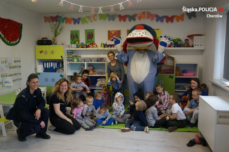 Policjantka z Zespołu Profilaktyki Komendy Miejskiej Policji w Chorzowie st. post Dagmara Białach spotkała się z przedszkolakami jednego z chorzowskich przedszkoli. Podczas wizyty policjantka przedstawiła milusińskim jak na co dzień wygląda praca policjanta oraz przypomniała o zasadach bezpiecznego poruszania się po drogach i konieczności noszenia odblasków po zmroku. Mundurowa uczyła dzieci, jak należy się zachowywać w różnego rodzaju sytuacjach zagrożenia. Przypomniała również numery telefonów alarmowych do służb ratowniczych. Główną atrakcją spotkania była policyjna maskotka Sznupek. Każde dziecko mogło także z bliska zobaczyć elementy wyposażenia policjanta jak i zrobić sobie pamiątkowy odcisk dłoni. Na koniec dzieci otrzymały odblaski.