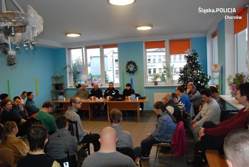 O bezpieczeństwie w trakcie ferii opowiadali sierż. szt. Wojciech Kmieć i mł. asp. Katarzyna Zgraja. Stróże prawa odwiedzili Dzienny dom pobytu dla osób niepełnosprawnych w Chorzowie. Stróże prawa informowali o zagrożeniach związanych z przebywaniem najmłodszych w pobliżu zamarzniętych zbiorników wodnych oraz o tym, jak uchronić się przed atakiem agresywnego psa. Wyjaśnili na co należy zwrócić uwagę podczas organizacji kuligu i zabawy w bitwę na śnieżki, by zakończyły się one szczęśliwie. Dzieci dowiedziały się również jak zachować się w przypadku kontaktu z obcymi osobami. Ponadto przypomnieli o ważnych telefonach alarmowych, z których należy korzystać wyłącznie w uzasadnionych przypadkach.