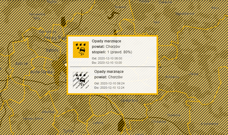 Biuro Prognoz Meteorologicznych IMGW-PIB w Krakowie ostrzega przed marznącymi opadami na obszarze Chorzowa 10 grudnia od godz. 6:00 do 13:00.