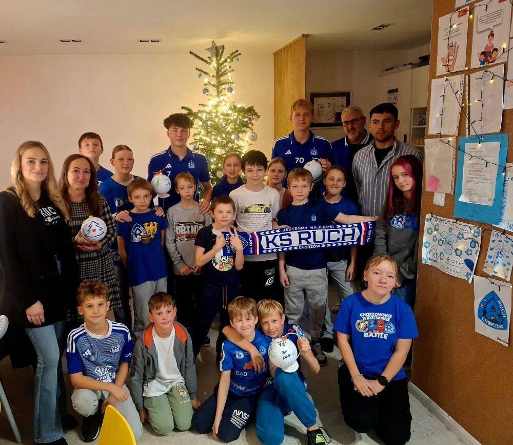 Młodzi zawodnicy pierwszej drużyny Ruchu, bramkarz Nikodem Proczek i obrońca Kajetan Klaja zrobili niemałą niespodziankę dzieciakom z Domu Aniołów Stróżów w Chorzowie-Batorym! Piłkarze „Niebieskich” wnieśli bardzo dużo radości swoją wizytą – dzieci miały możliwość rozmowy z zawodnikami, a także zagrać z nimi w gry planszowe! Dzieci i zawodnicy wspólnie tworzyli ozdoby świąteczne, które wkrótce trafią na licytację – pozyskane środki zostaną przekazane na wsparcie podopiecznych Domu Aniołów Stróżów.