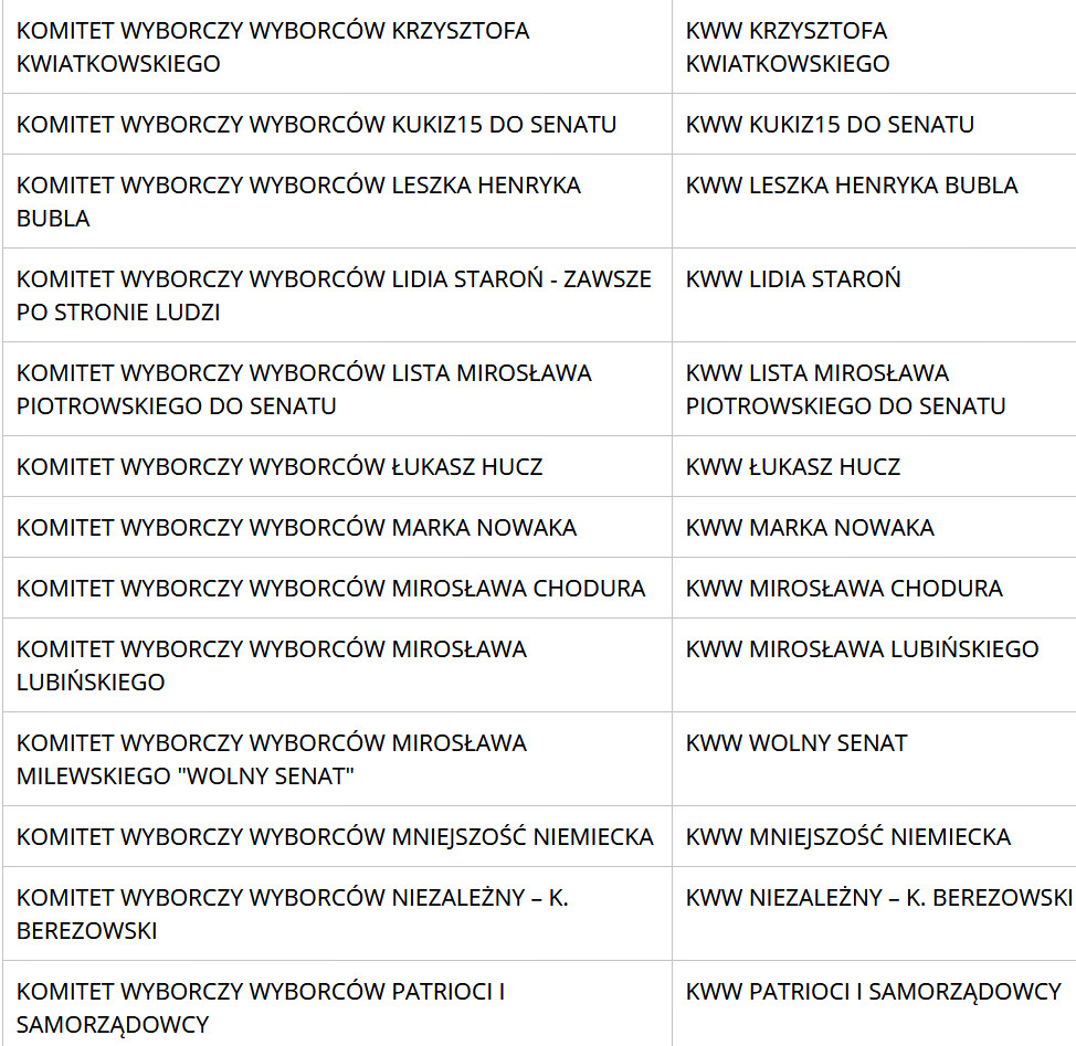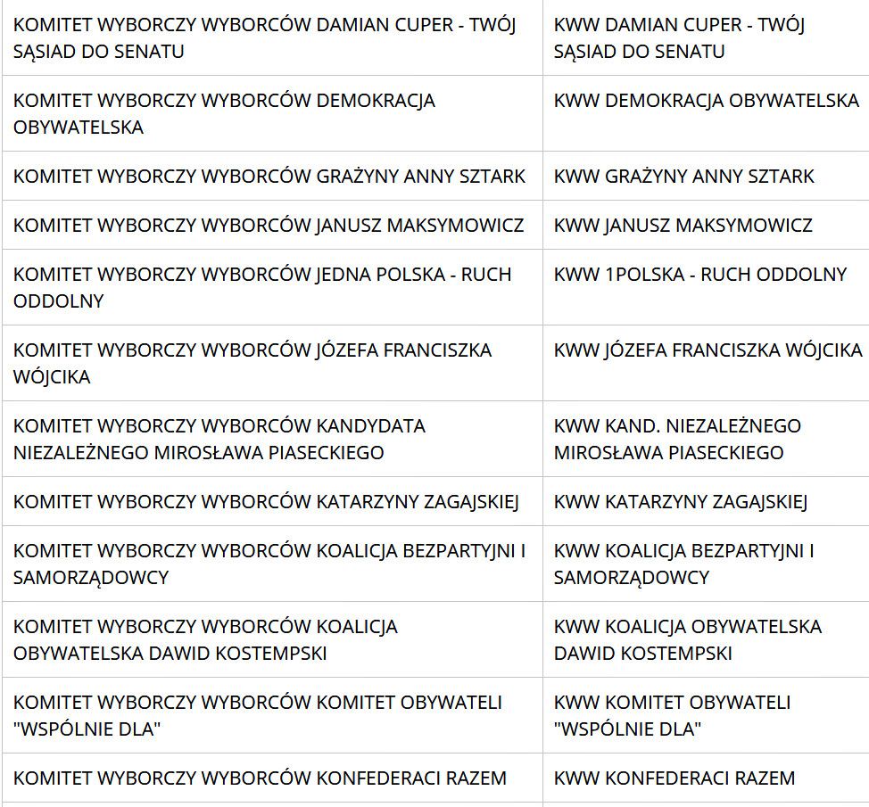 Termin składania zawiadomień o utworzeniu komitetu wyborczego minął wczoraj. Wśród zarejestrowanych przez PKW komitetów przeważają komitety wyborców – jest ich 57. Zarejestrowano też 30 komitetów partii politycznych i jeden komitet koalicyjny. Swoje komitety zgłosiły oczywiście najważniejsze siły polityczne w kraju, czyli Prawo i Sprawiedliwość, Koalicja Obywatelska, Lewica czy Polskie Stronnictwo Ludowe razem z Kukiz,15. Jest jednak sporo komitetów, które mają zamiar zgłaszać tylko jednego kandydata na senatora oraz komitetów o dosyć ciekawych nazwach, takich jak: KW Akcja Zawiedzionych Emerytów Rencistów, KW Partia Kierowców, KW Piast – Jedność Myśli Europejskich Narodów lub KW Związku Słowiańskiego. Pełną listę zarejestrowanych komitetów można znaleźć na stronie PKW oraz w galerii poniżej.