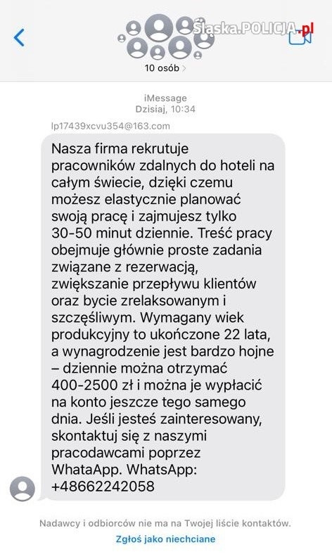 Apelujemy o ostrożność i zdrowy rozsądek. Wyjątkowo atrakcyjna oferta pracy, oferowana w wiadomości SMS-owej czy mailowej, najczęściej jest oszustwem. - czytamy na stronie policji.